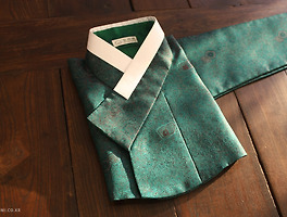 고름 없는 간결한 디자인이지만 원단의 무늬와 색깔로도 시선을 사로 잡는 저고리.