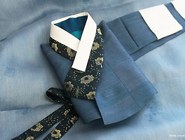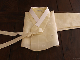 무늬 없는 깔끔한 진한 상아색 저고리에 남색 고름,