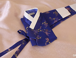 이 화사함과 경쾌함 사이에서 무게를 맞추듯, 진한 남색의 고름 또한 멋스러운 포인트죠.