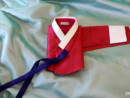 저고리 전체를 커다란 바둑판처럼 가로로 한 줄, 세로로 또 한 줄씩 접어박기하여 넓은 격자무늬를 만들었습니다.