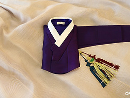 시원한 이 한 벌의 한복에 박쥐 삼작 노리개로 멋을 더합니다.