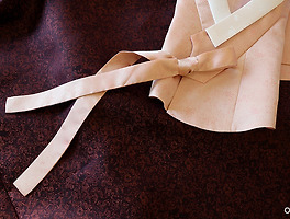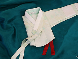 그리고 이 맑고 깔끔한 한 벌에 신부다운 이미지를 추가하고자, 새빨간 고름을 달고 청록색 안고름을 달았습니다.