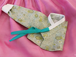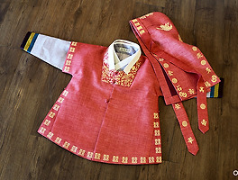 붉은 잎새단 반수의와 색동소매 저고리, 풀색 바지의 남자아이 한복 한 벌을 지었습니다.