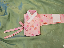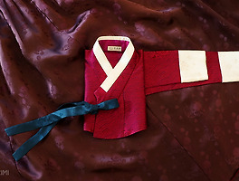 대신 저고리에 갈색에 가까운 붉은 고름을 달고, 자줏빛 안고름을 함께했습니다. 상의에서 가진 여성스러움과 하의가 가진 중성적이고 멋스러운 분위기가 합쳐져 독특한 색 조합을 보여주는 한 벌이 되었습니다.