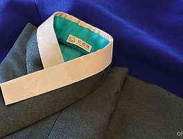 높이 올라온 목깃과 하얀 동정, 소매와 아주 세련되게 어우러지는 파란색 원단으로 저고리를 지었습니다.