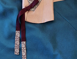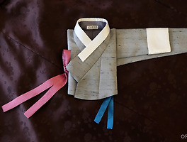 부드러운 미색에 가까운 흰색 저고리에 파란 고름을 달고, 아주 진한 자줏빛이 묻어나는 검정 치마와 함께한 한복 한 벌입니다. 저고리 아래로 늘어뜨리는 새빨간 안고름을 추가해 약간의 장식을 더했습니다.