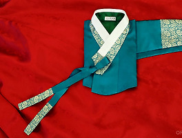 연한 연두색 바탕에 옥색과 연두색 계열의 색상들이 함께 꽃을 그려내고 있어요. 자세히 보면 볼 수록 예쁘다 감탄이 나오는 매력 가득한 색상들로 짜여진 원단의 저고리에는 짙은 빨강색 고름을 달았습니다. 허리께엔 밝은 파랑색 안고름을 달아줍니다.