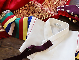 선명한 초록색 양단 저고리를 입고, 색색깔의 꽃이 장식된 새빨간 치마를 함께 입었습니다. 옷을 찾으러 온 김에 마지막 점검차 한 번 입어보았을 뿐인데, 원래 입던 옷마냥 정말 잘 어울리죠?
