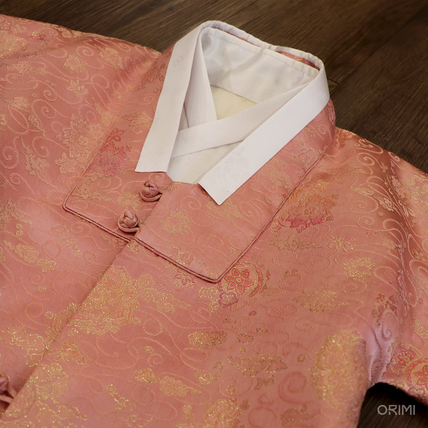 금사 문양이 있는 진분홍색 양단으로 답호(반수의)와 복건을 만들었어요. 은은한 미색의 저고리에 소매 끝에만 차분한 색으로 색동 배색을 넣어 소매를 장식했고, 경쾌한 초록 바지를 함께 지었습니다.