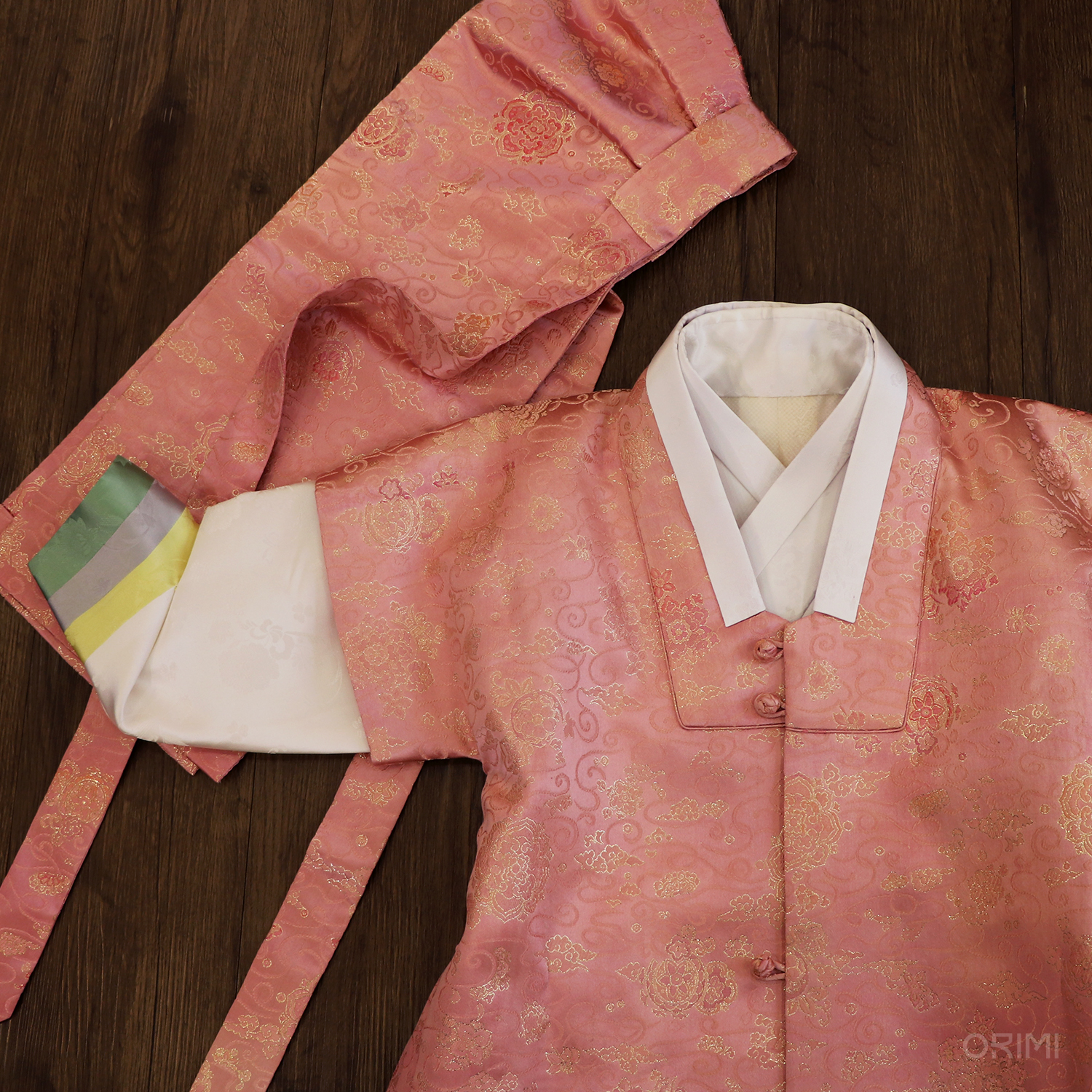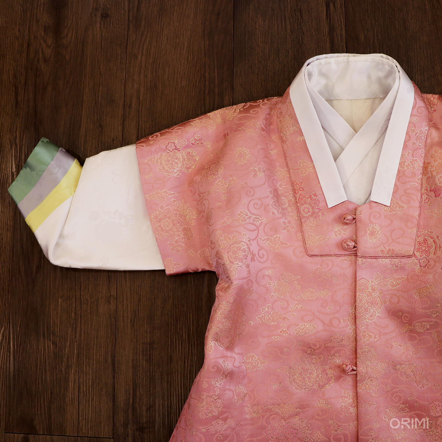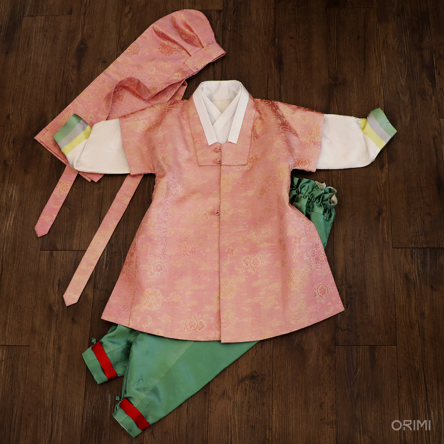 금사 문양이 있는 진분홍색 양단으로 답호(반수의)와 복건을 만들었어요. 은은한 미색의 저고리에 소매 끝에만 차분한 색으로 색동 배색을 넣어 소매를 장식했고, 경쾌한 초록 바지를 함께 지었습니다.