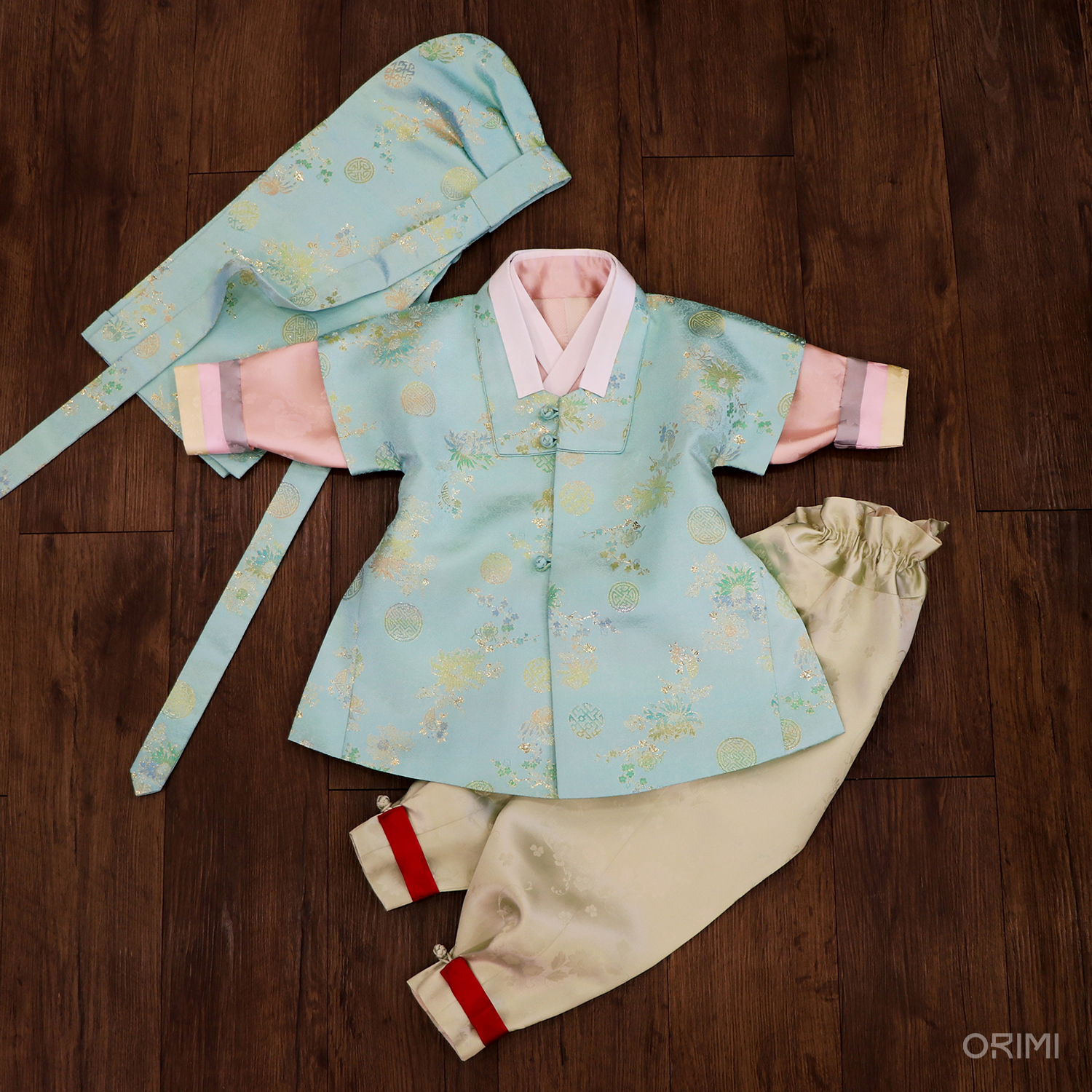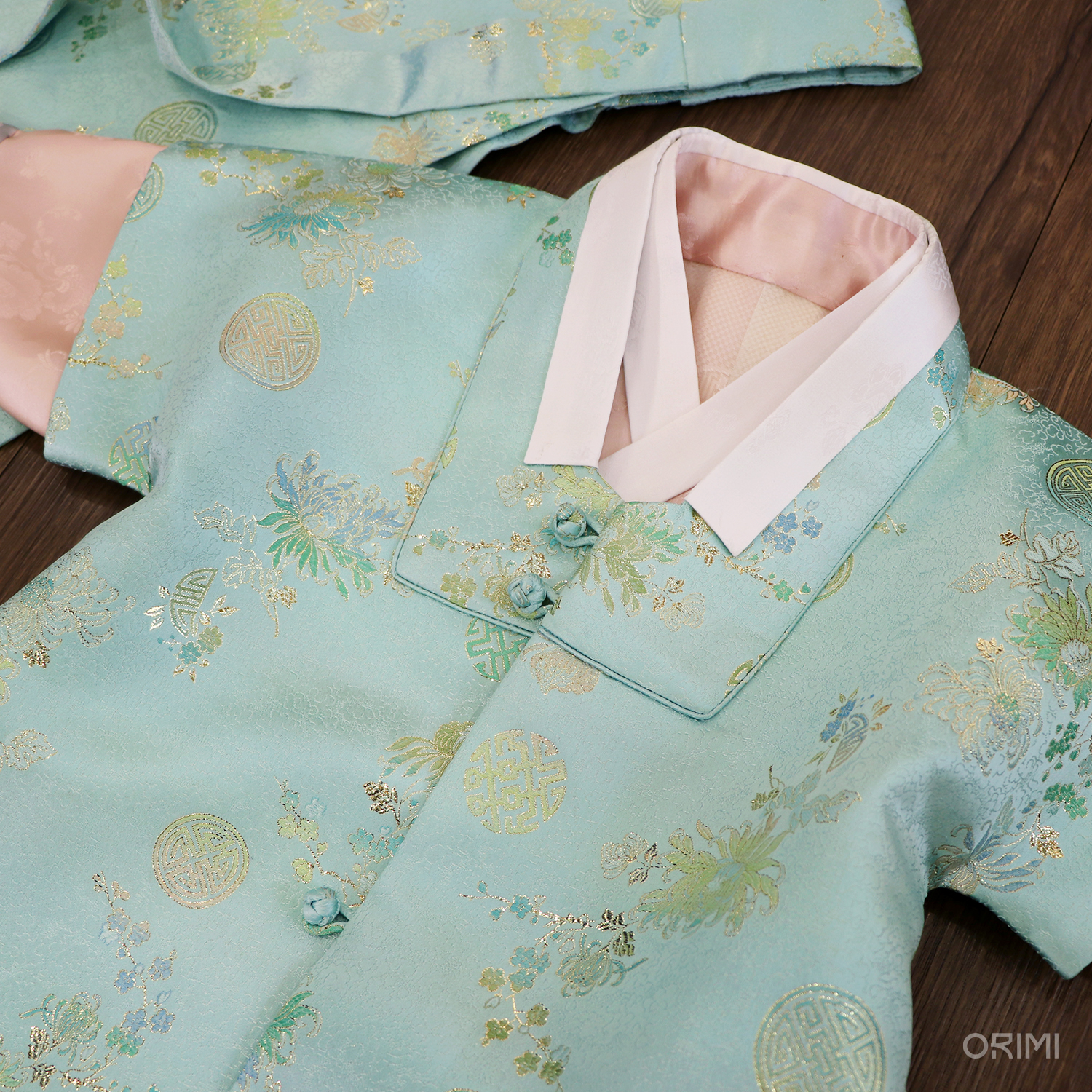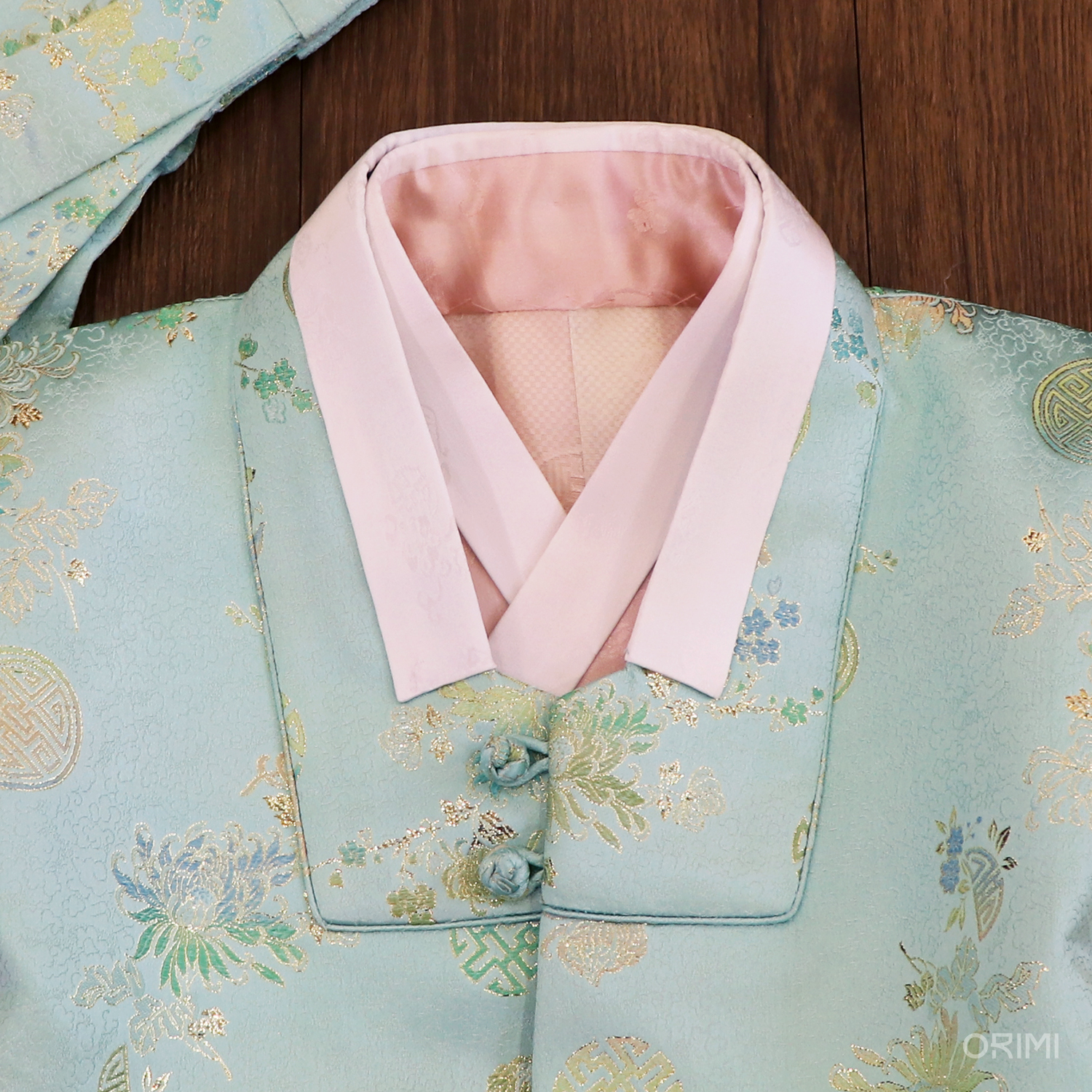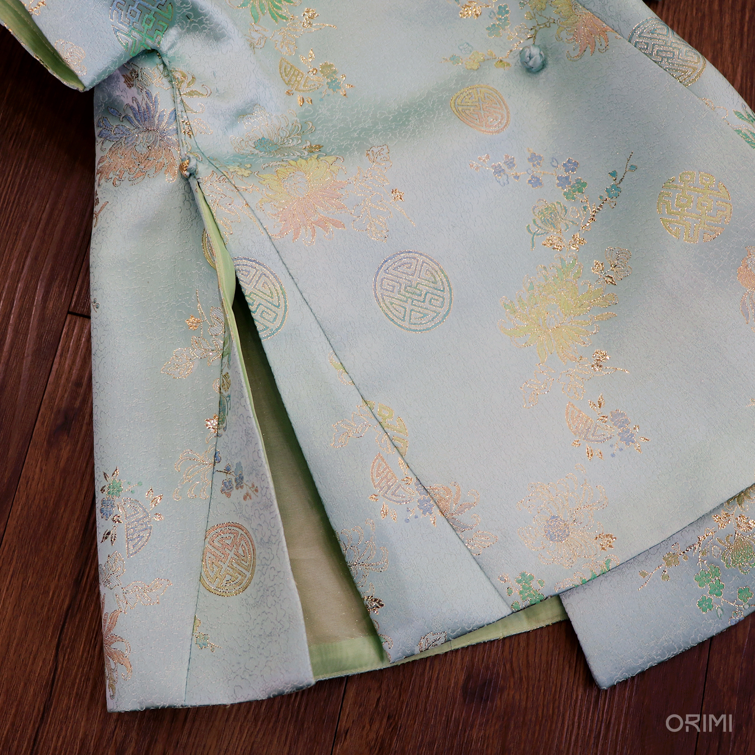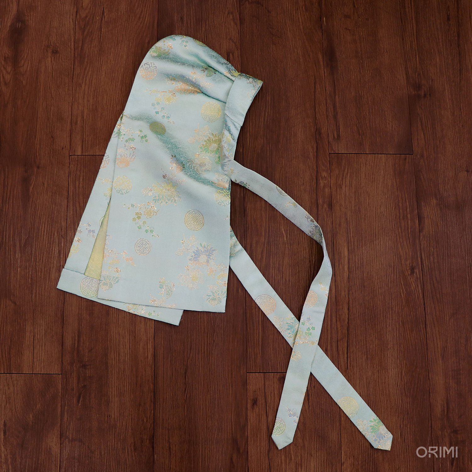 화려한 색상과 반짝이는 금사가 화려하게 어우러진 연옥색 양단으로 답호(반수의)를 짓고, 같은 원단으로 복건도 만들었습니다.