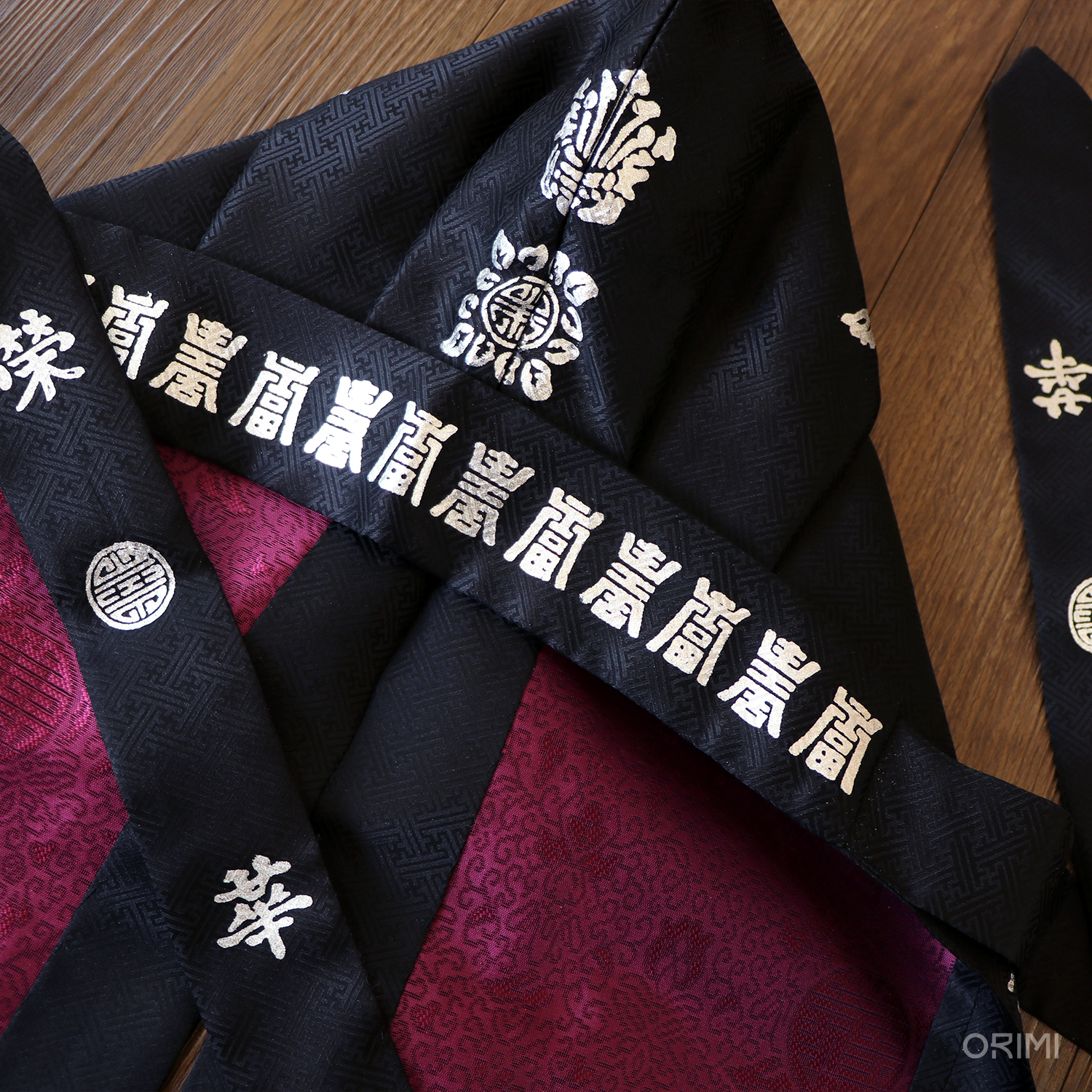 은박이 화려하게 가득 찍힌 복건도 함께 착용하면 전통적인 분위기가 더욱 강렬해질 거에요.