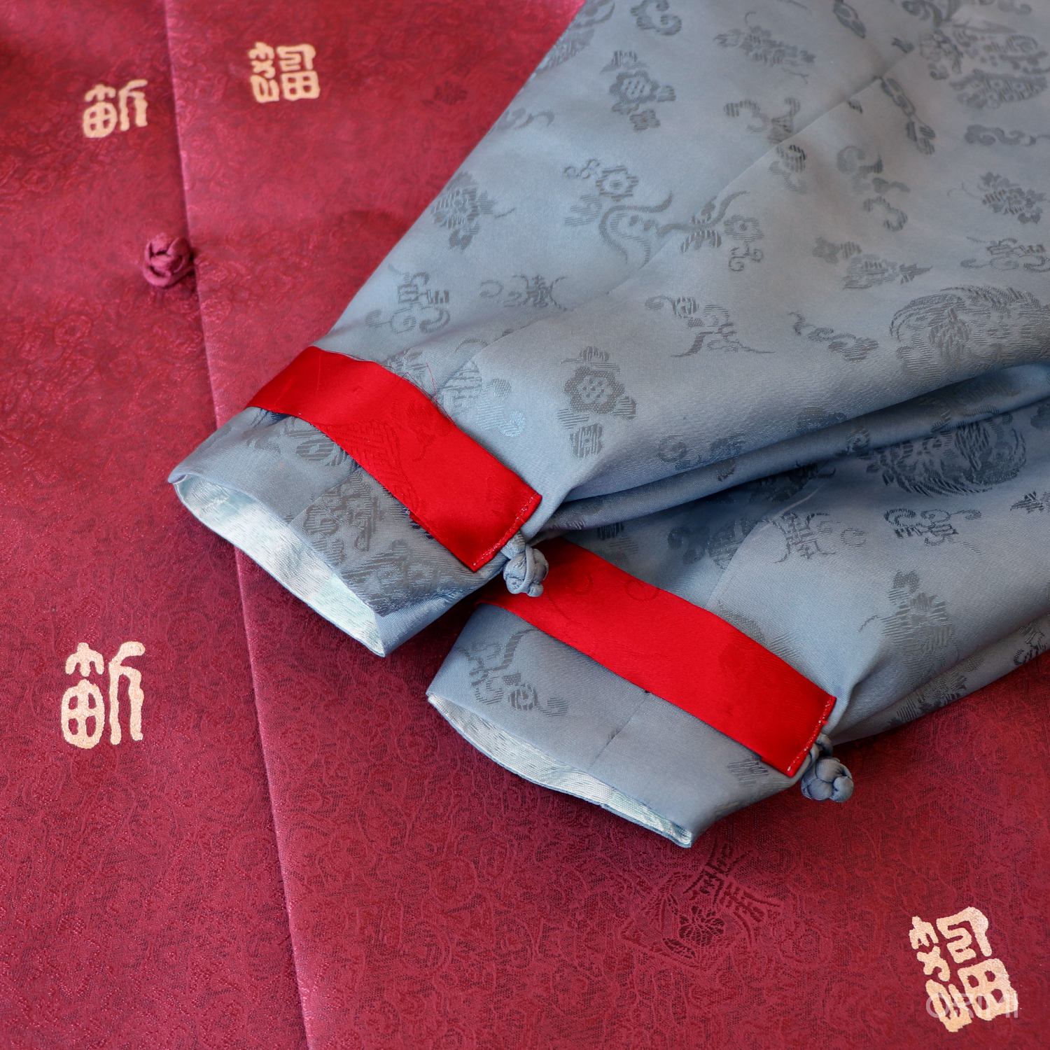 밝은 남색의 양단으로 지은 답호에, 멋스러운 문자문 은박을 찍어 완성한 한 벌입니다.