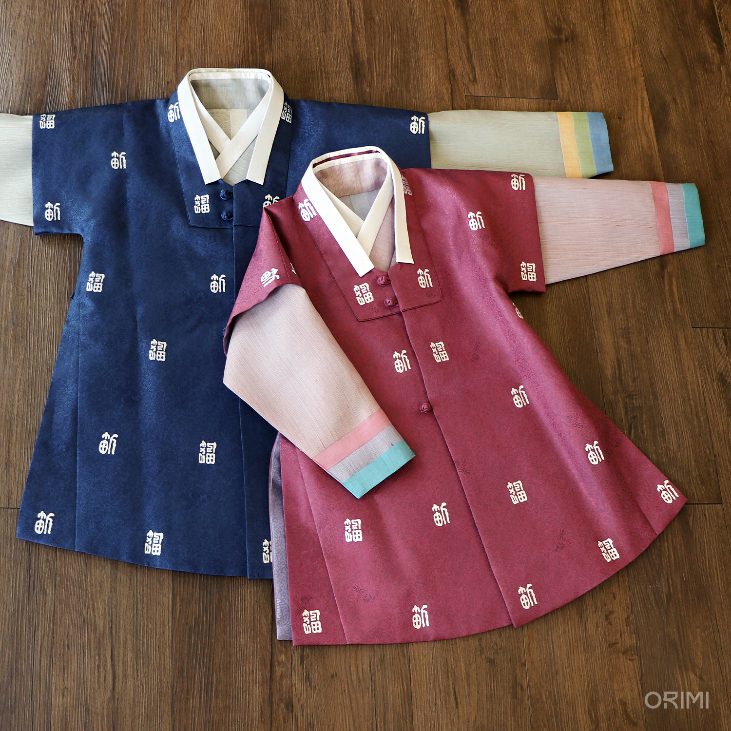 거친 결 무늬가 특이한 연분홍 원단으로 지은 저고리의 소매에는 3단으로 색동 장식을 넣었어요. 경쾌한 진하늘색 바지를 함께하여 완성한 오리미의 아이한복입니다.