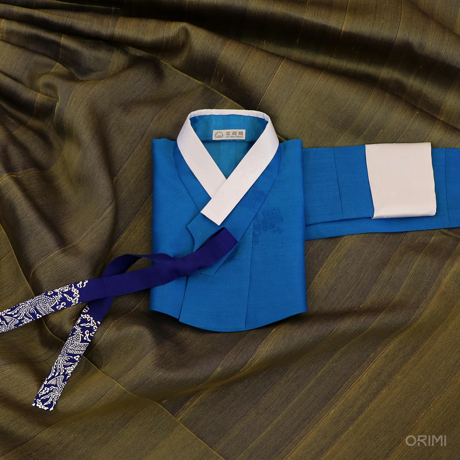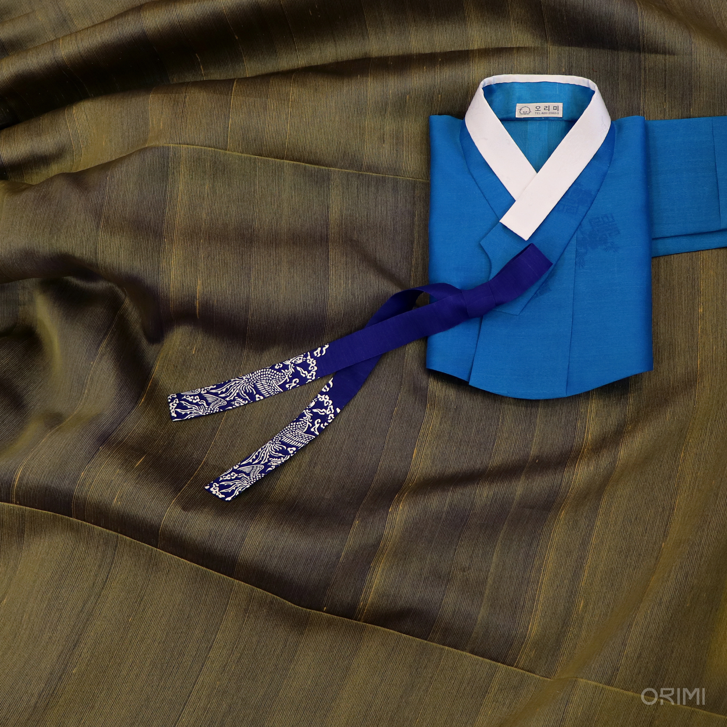 밝은 파랑색 저고리에 청색 고름을 달고, 고름 끝에 봉황문 은박을 찍어 장식을 더했습니다. 가로줄 사이사이로 짙은 청빛이 드러나는 풀색 치마를 함께한 시어머니 혼주한복입니다.