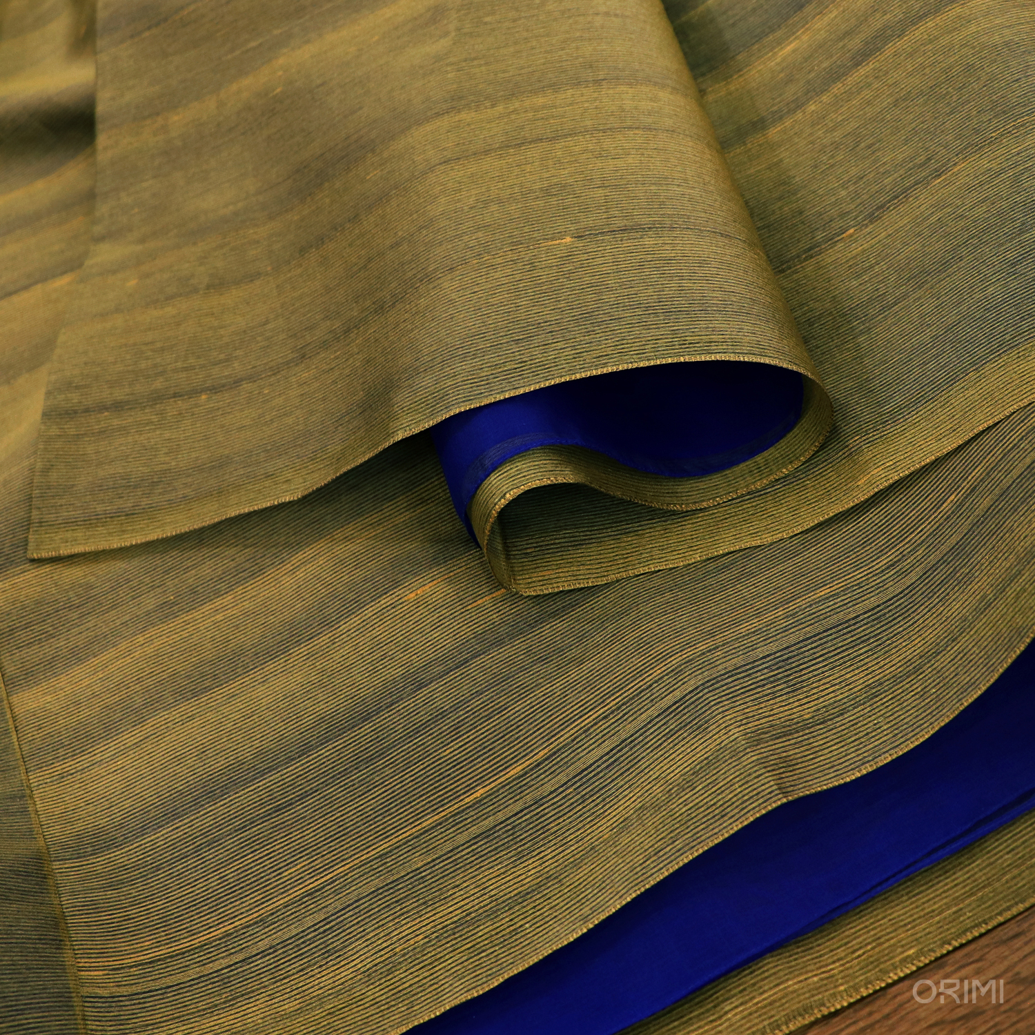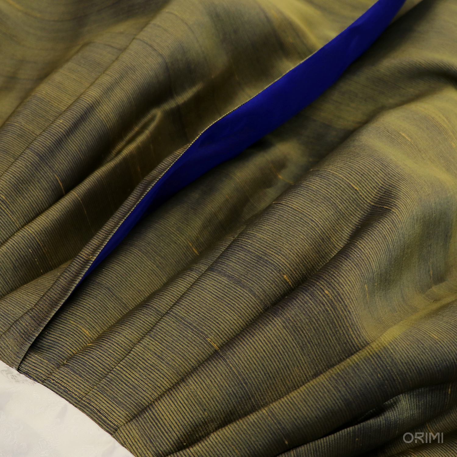 선명한 청색을 안감으로 넣어, 짙은 풀색과 어우러진 오묘한 빛깔을 자랑하는 멋스러운 치마가 함께한 시어머니 혼주한복입니다.