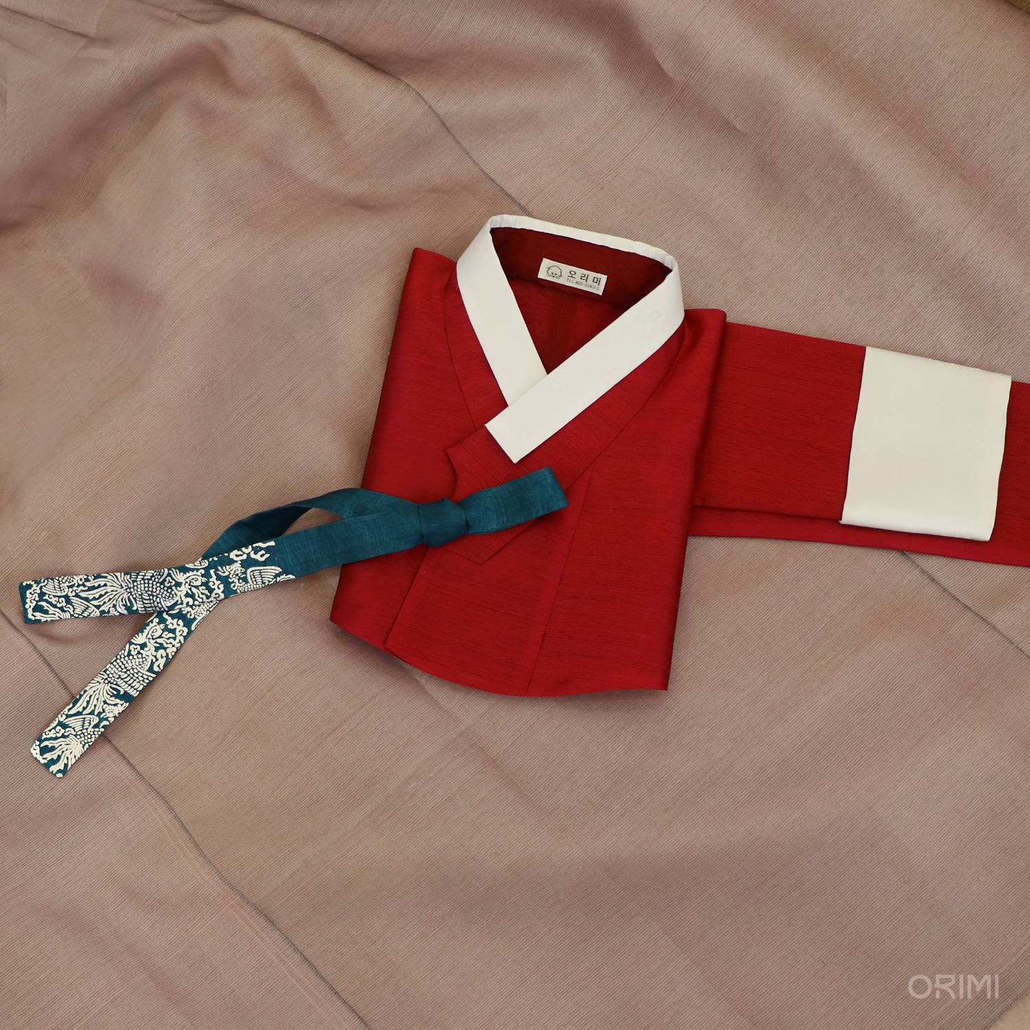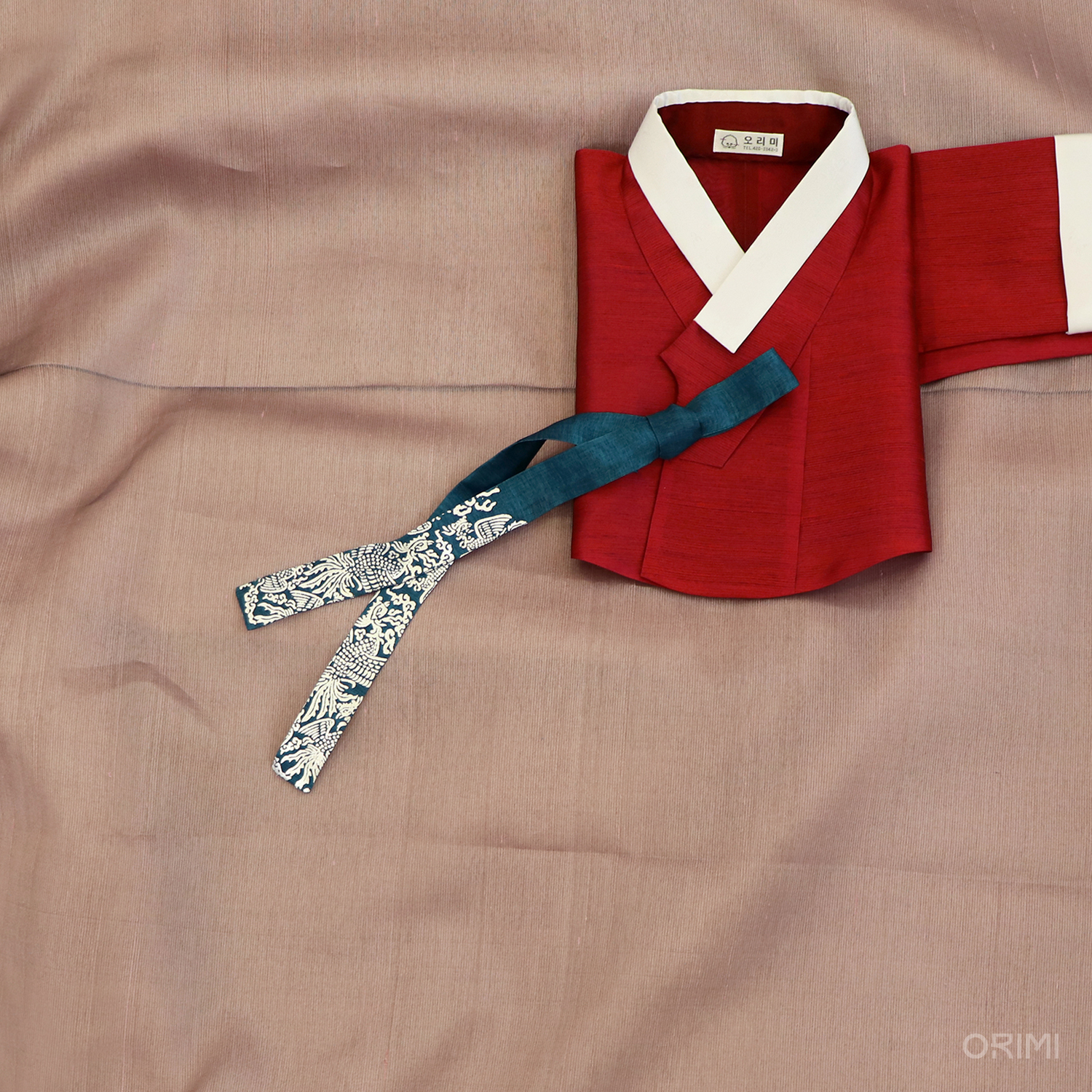 선명하면서도 묵직한 느낌을 주는 붉은 저고리에는 청록 고름을 달고, 봉황문 은박을 찍어 장식을 더했습니다. 회색빛이 도는 분홍 치마와 함께한 이 한 벌은 친정어머니를 위한 혼주한복으로 지었습니다.