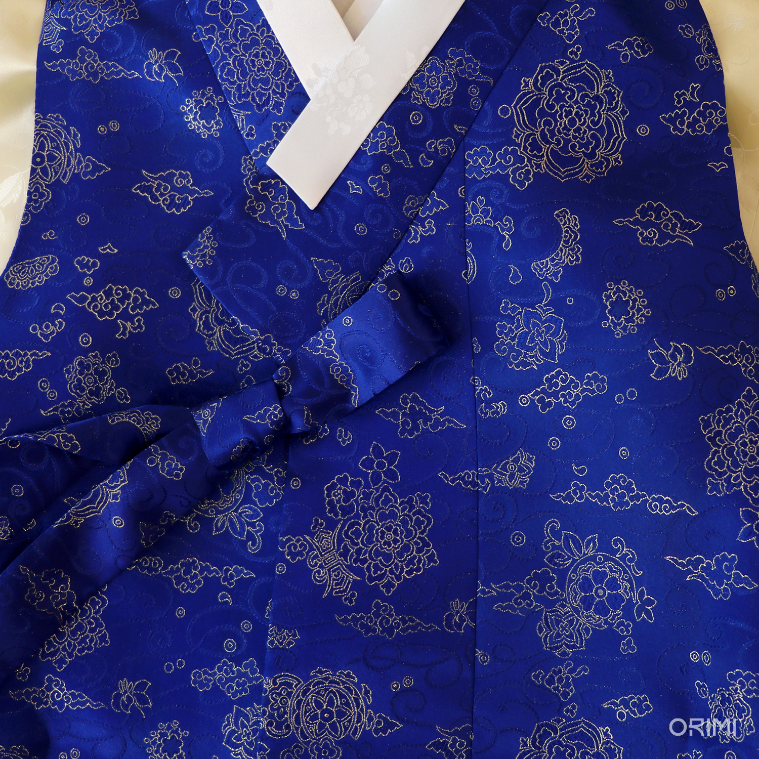 새파란 바탕 위에서 반짝이는 금사가 멋진 양단으로 지은 쾌자와 복건. 연노랑색 저고리와 바지를 함께해 겉옷과의 대비를 아름답게 연출했습니다.