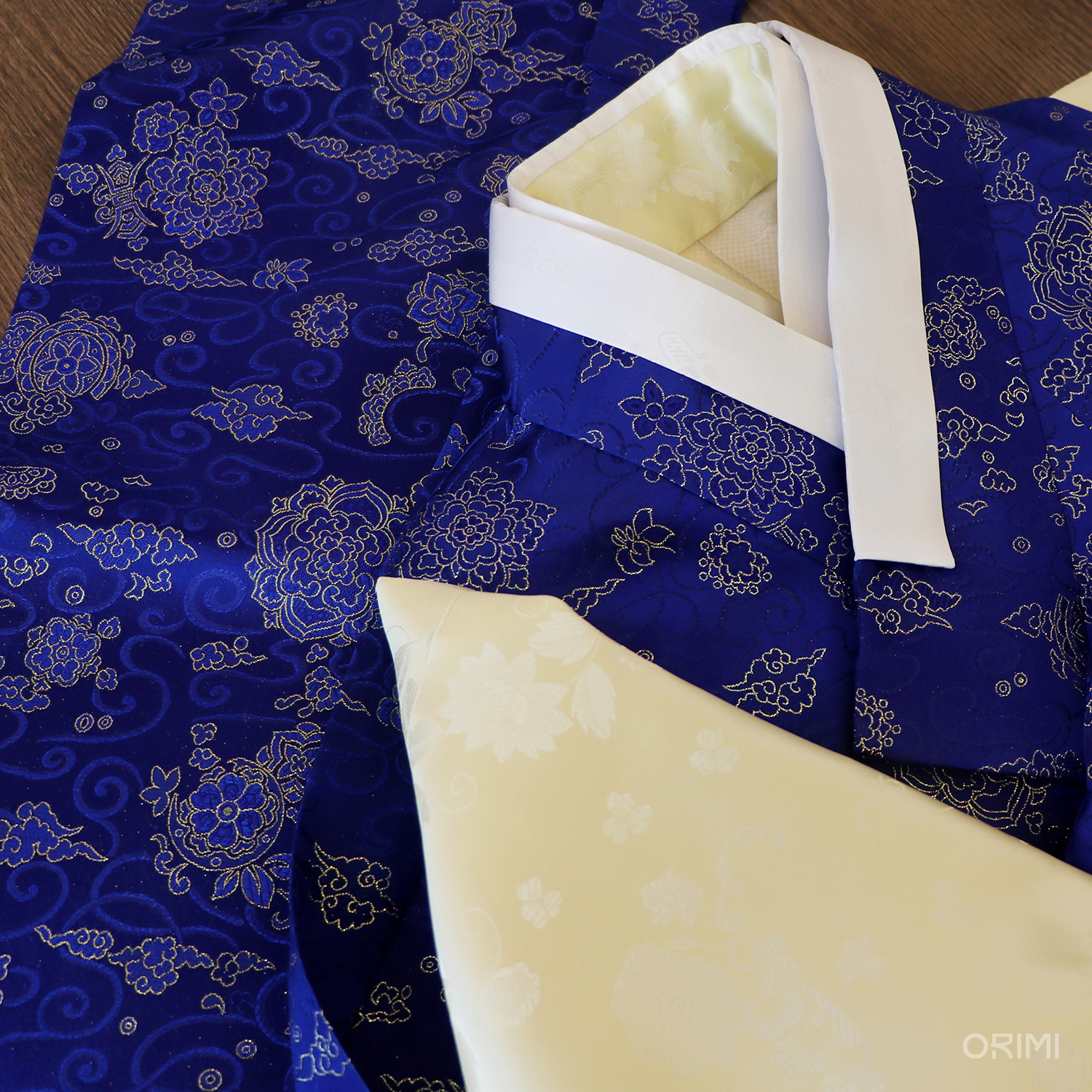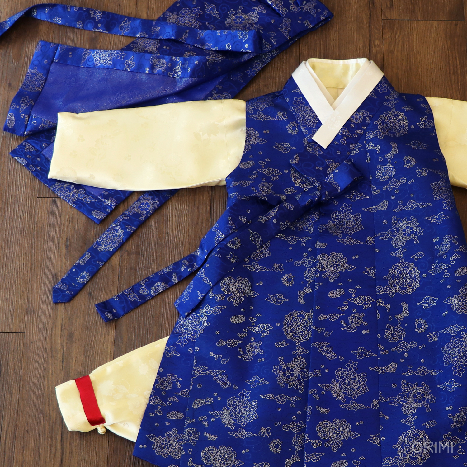 새파란 바탕 위에서 반짝이는 금사가 멋진 양단으로 지은 쾌자와 복건. 연노랑색 저고리와 바지를 함께해 겉옷과의 대비를 아름답게 연출했습니다.