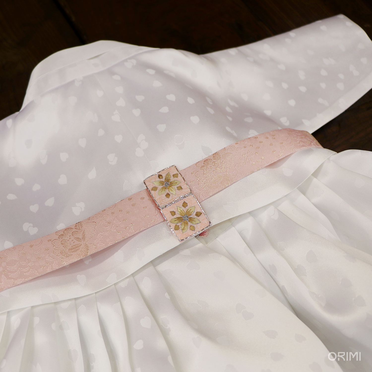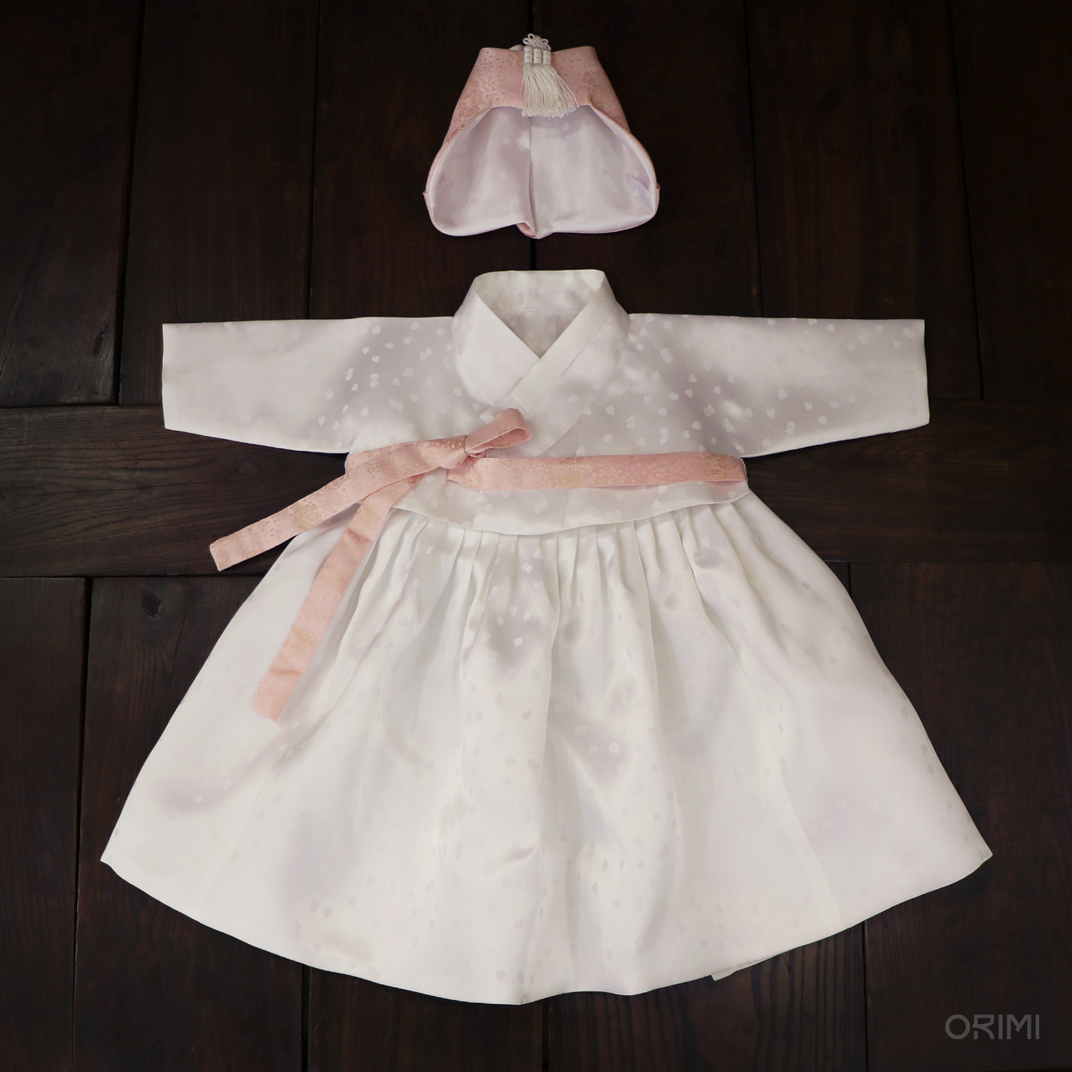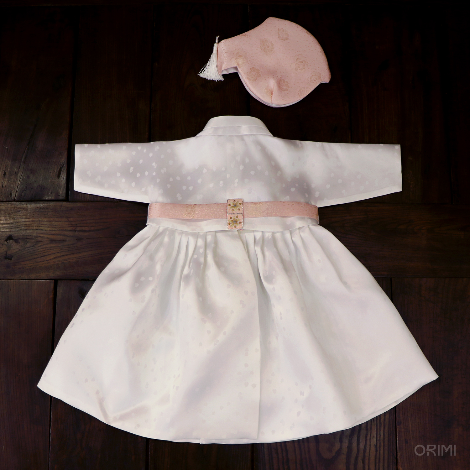 새하얀 실크로 지은 저고리와 치마, 그리고 고름과 맞춘 양단 조바위. 할머니의 사랑을 담은 백일선물이기에 더욱 정성스레 지은 백일한복입니다.