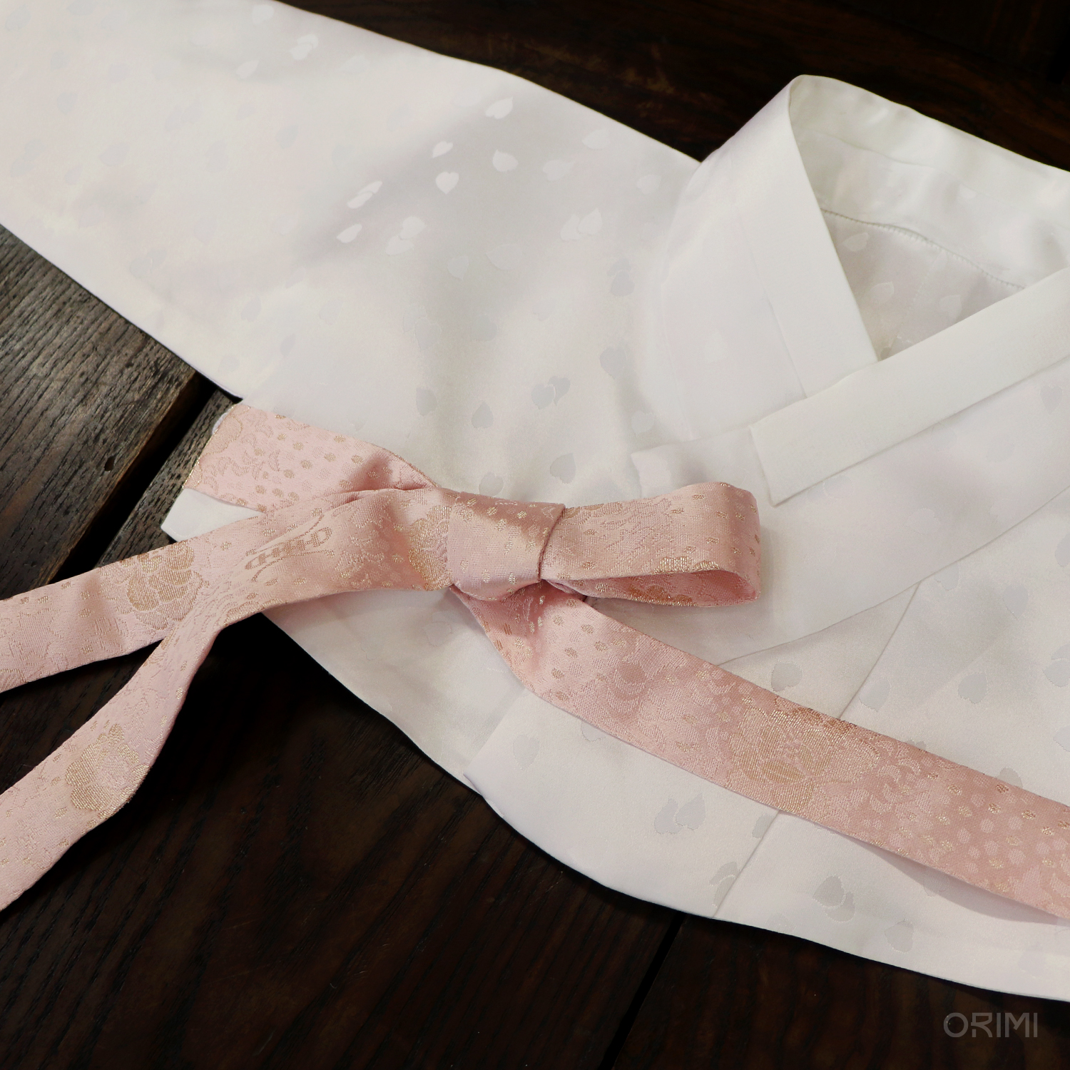 장식성과 실용성을 위해 가슴께를 둘러 묶는 고름을 연분홍색 양단으로 만들어 달았습니다.