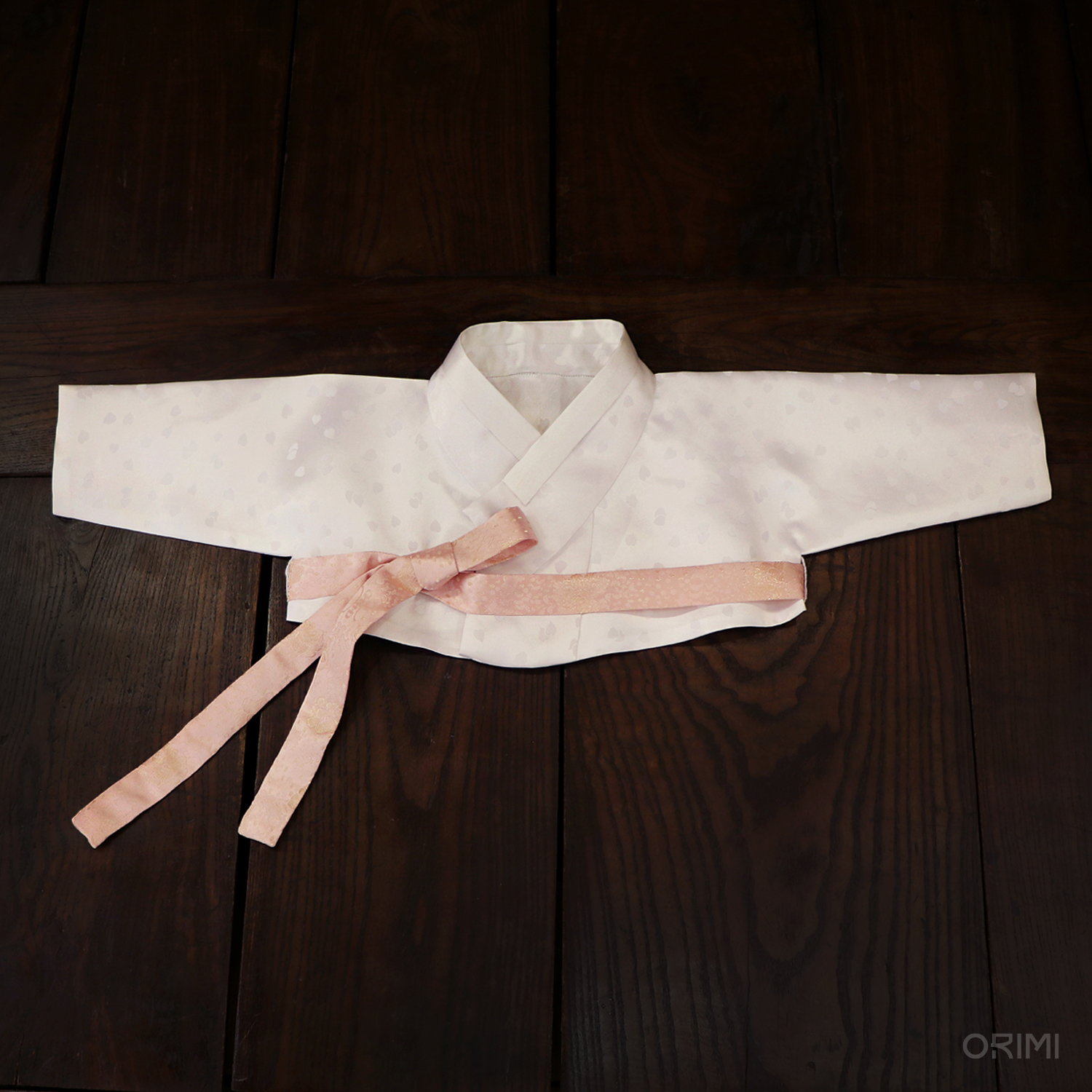장식성과 실용성을 위해 가슴께를 둘러 묶는 고름을 연분홍색 양단으로 만들어 달았습니다.