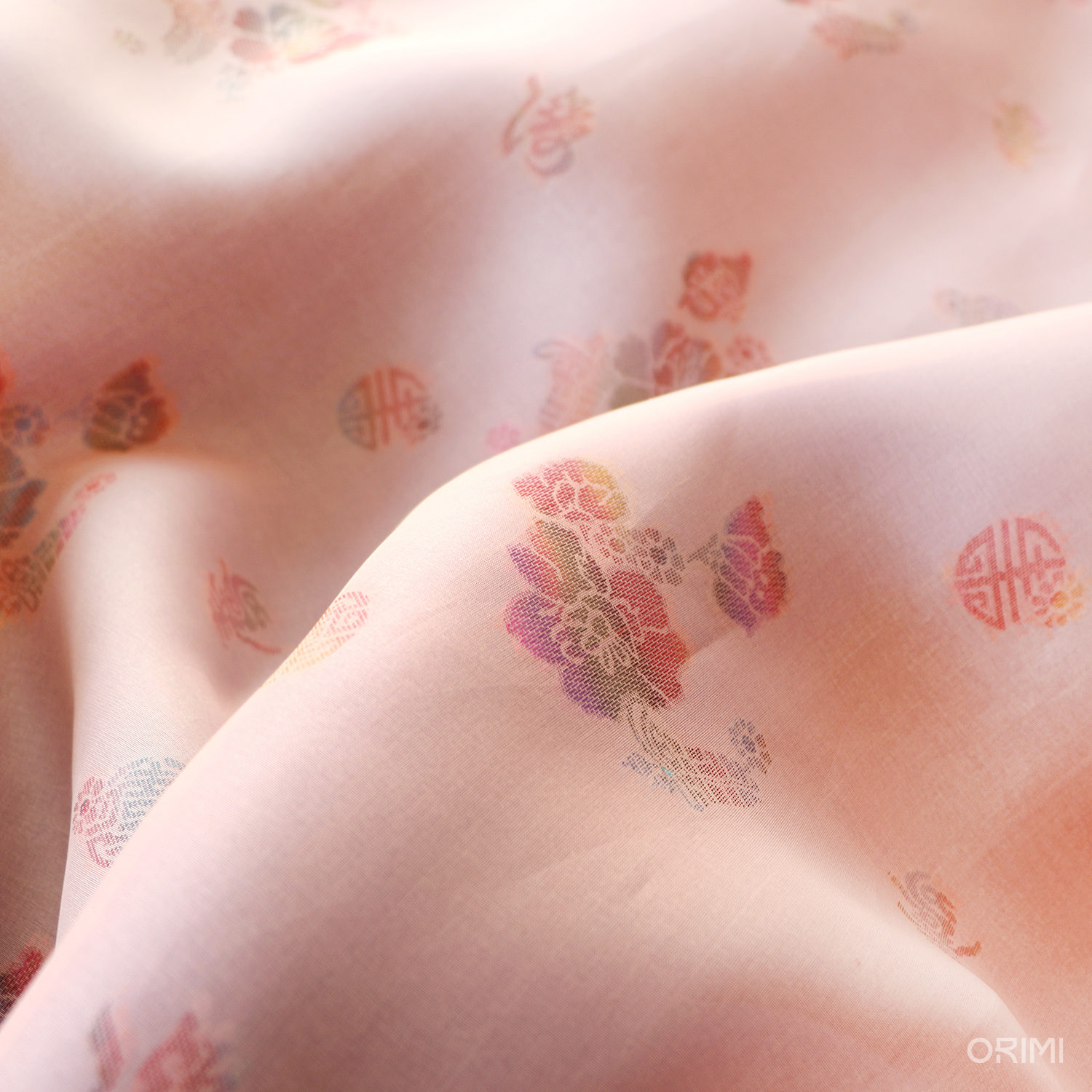 연분홍 바탕 위 여유롭게 살랑이는 듯한 꽃무늬, 새파란 바탕 위에 굵은 선으로 밀도있게 꽉 차여진 꽃무늬. 이 두 가지 꽃무늬의 대비가 매력적인 공연 한복입니다. 모든 장식을 생략하고 깔끔하게 만들어 이 아름다운 원단의 문양과 질감에 오롯이 집중되도록 했습니다.