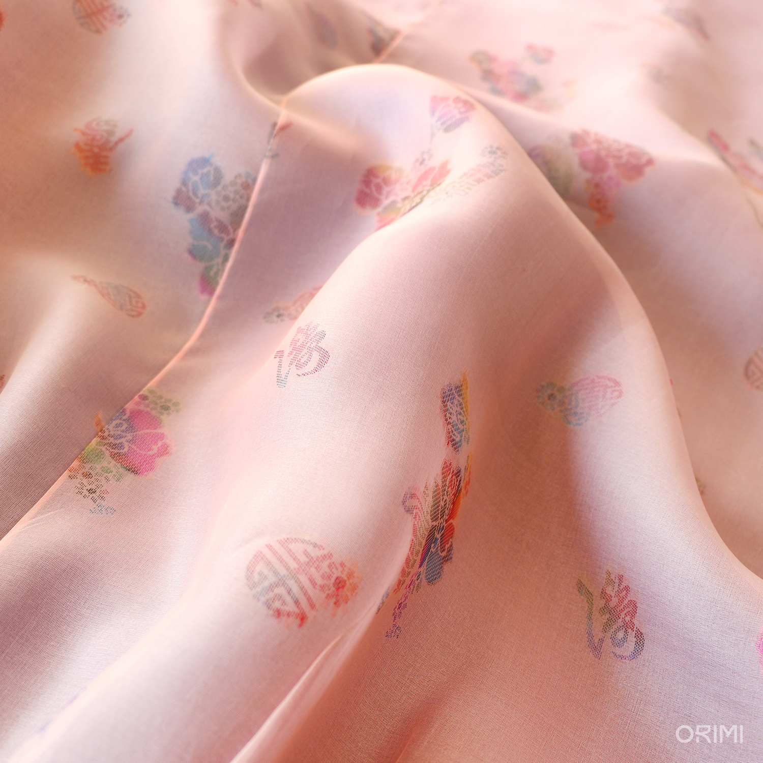 연분홍 바탕 위 여유롭게 살랑이는 듯한 꽃무늬, 새파란 바탕 위에 굵은 선으로 밀도있게 꽉 차여진 꽃무늬. 두 가지 꽃무늬의 대비가 매력적인 한 벌입니다.