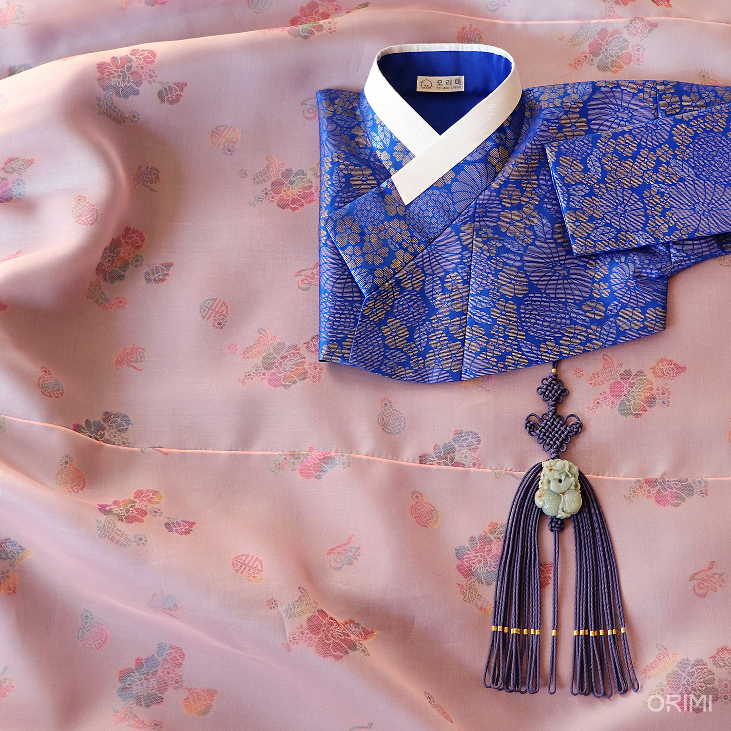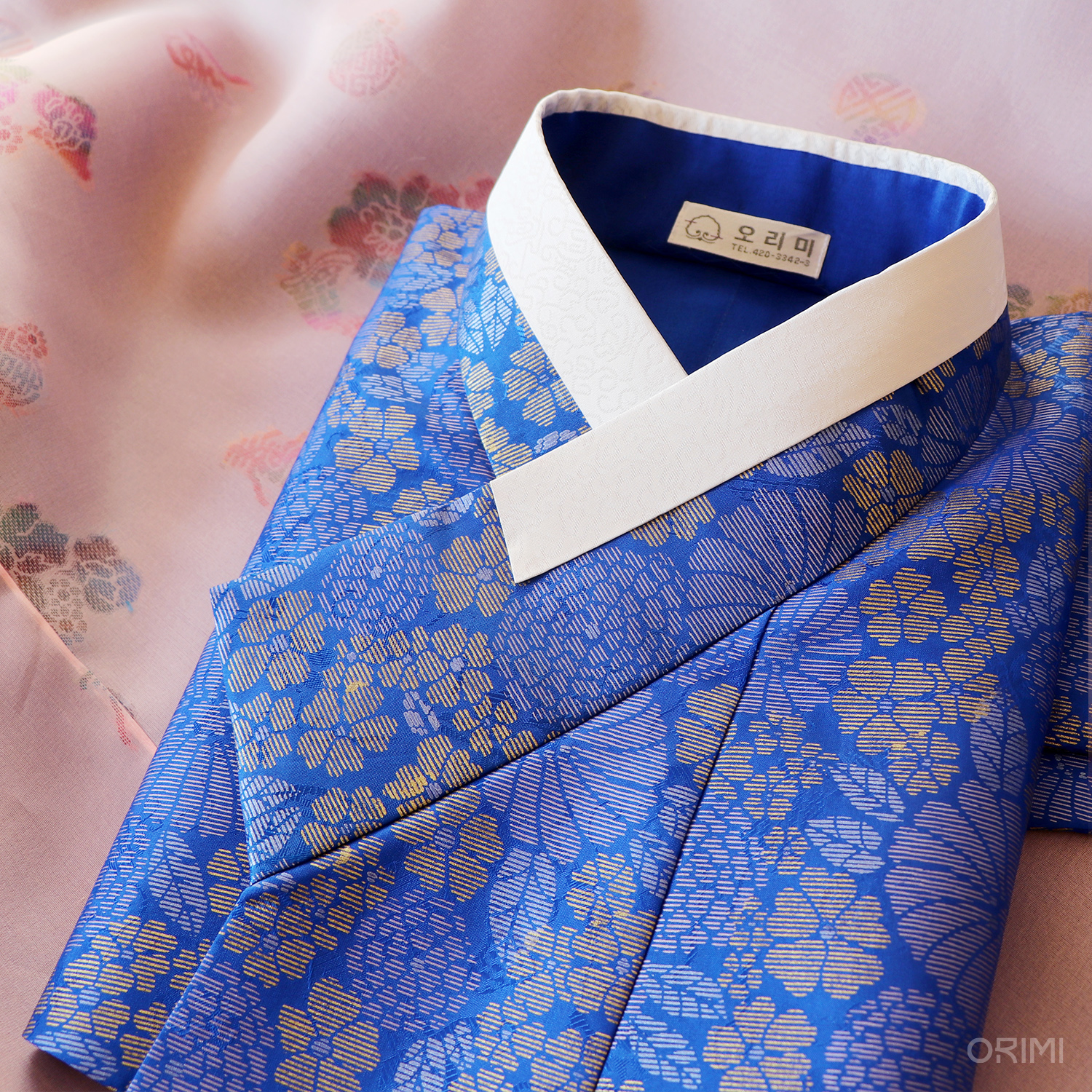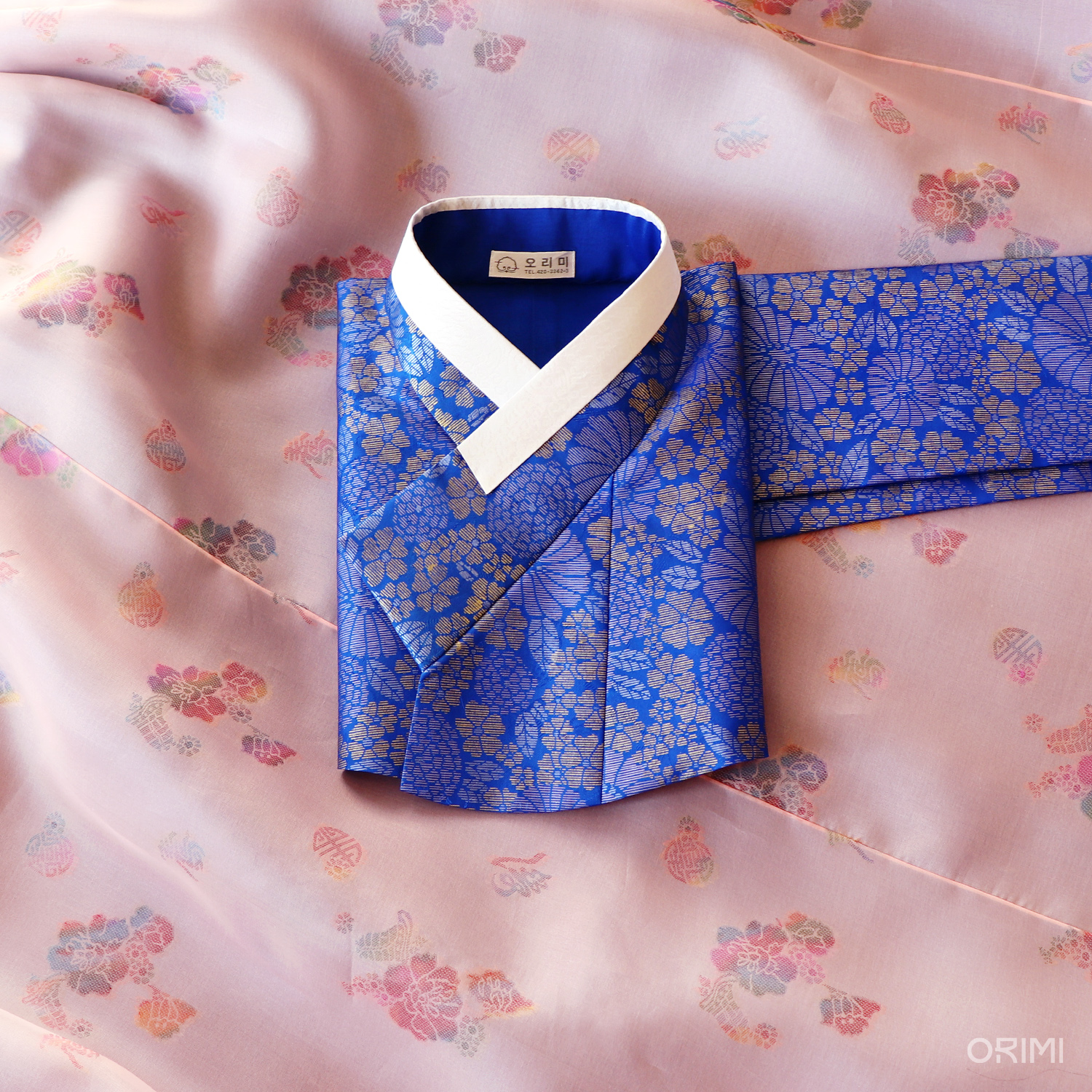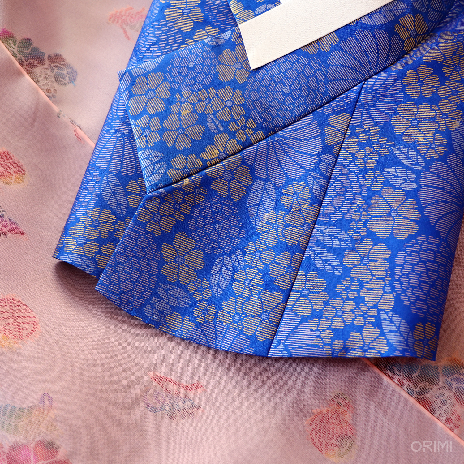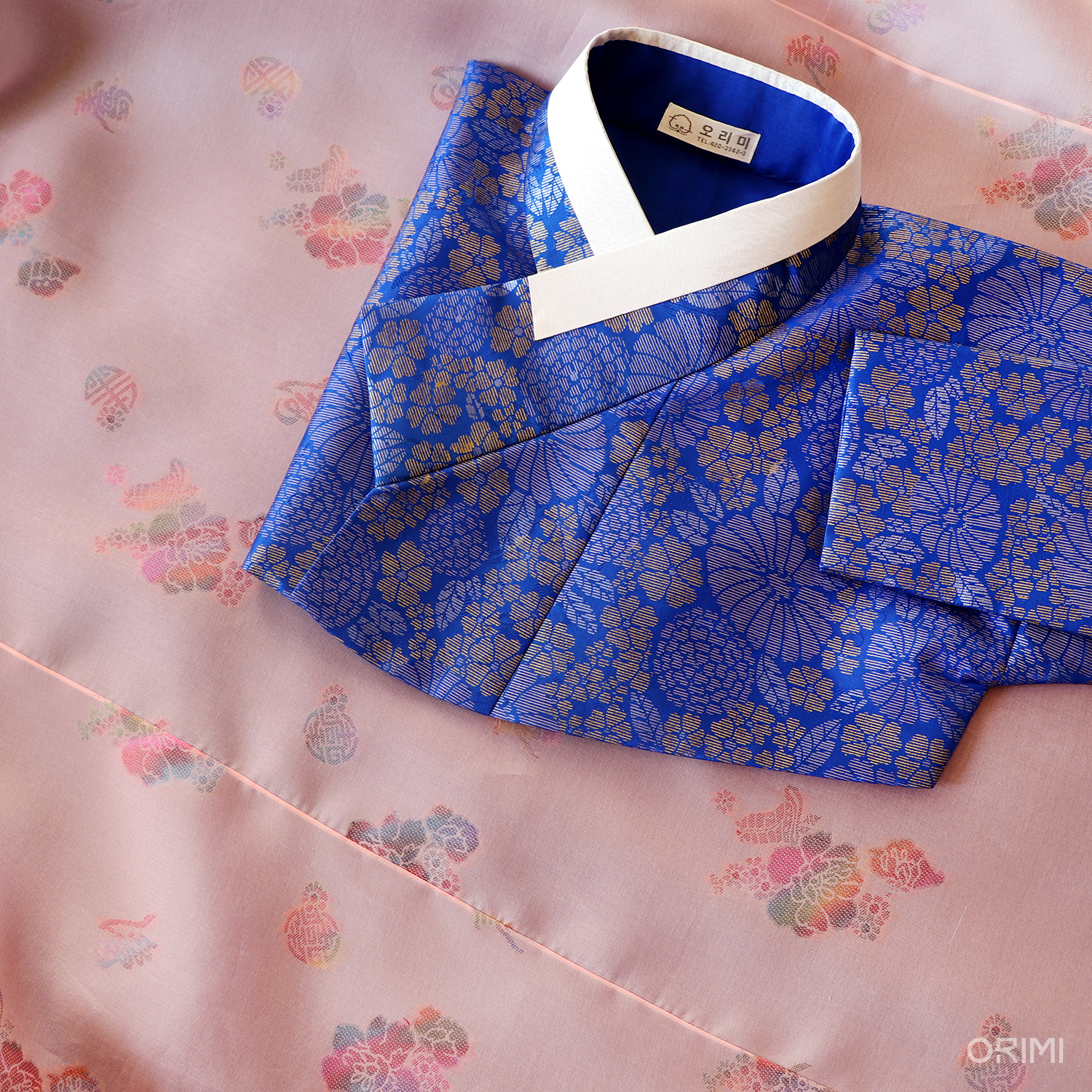 연분홍 바탕 위 여유롭게 살랑이는 듯한 꽃무늬, 새파란 바탕 위에 굵은 선으로 밀도있게 꽉 차여진 꽃무늬. 이 두 가지 꽃무늬의 대비가 매력적인 공연 한복입니다. 모든 장식을 생략하고 깔끔하게 만들어 이 아름다운 원단의 문양과 질감에 오롯이 집중되도록 했습니다.
