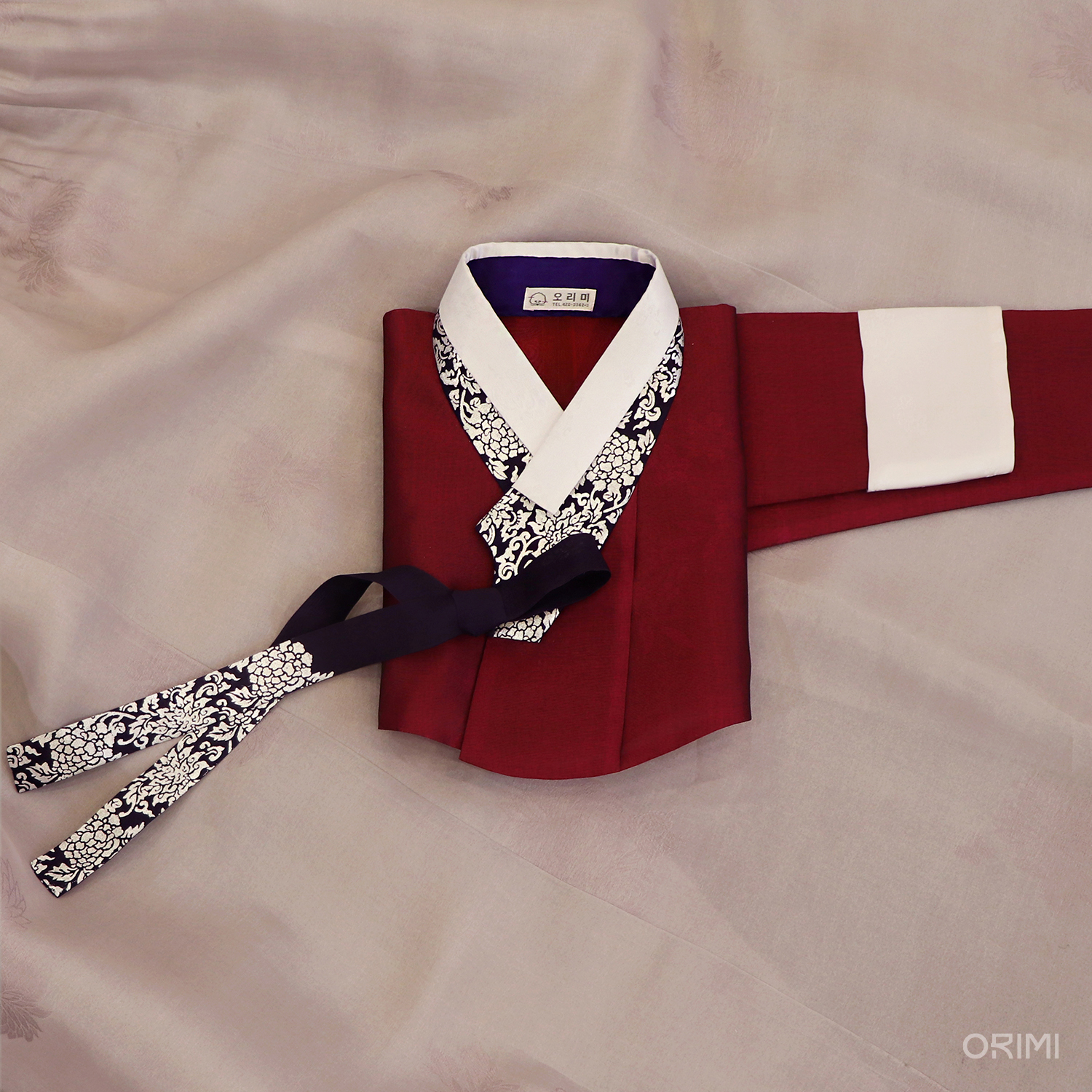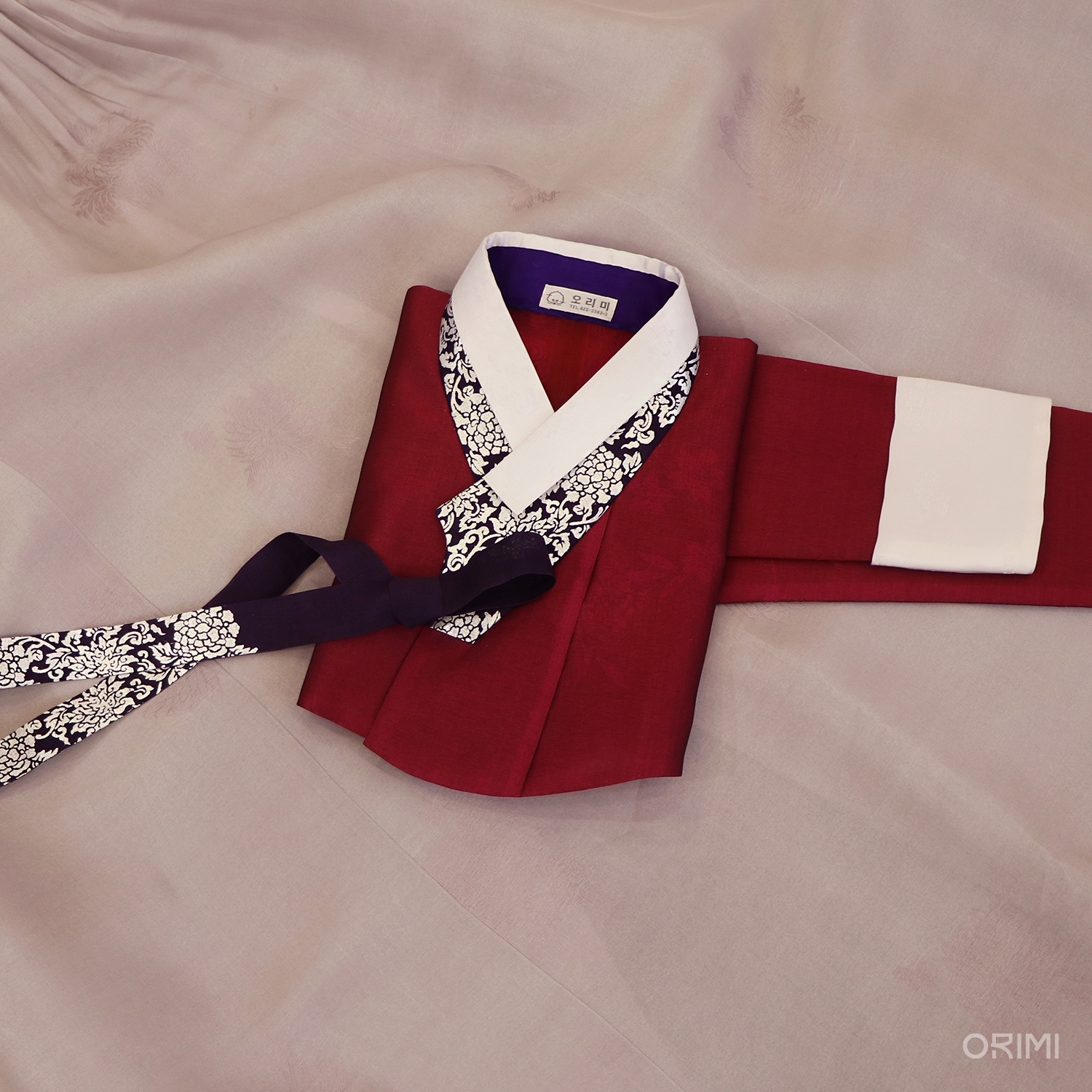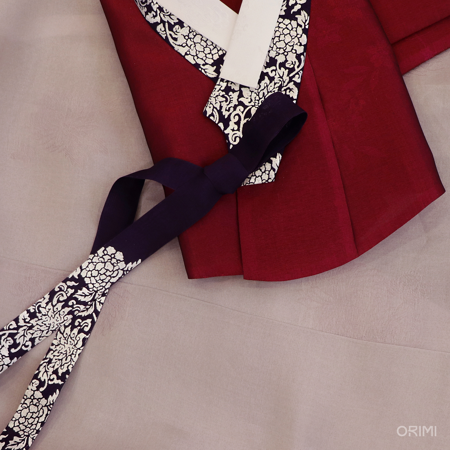 진붉은 저고리에 진보라색 고름과 깃을 달고, 모란문 은박을 찍어 장식을 더했습니다. 본래 가지고 계셨던 치마에 저고리를 더해 새옷처럼 연출하면서도 시어머님 한복과도 분위기를 맞춰 드린, 친정어머님의 혼주한복입니다.