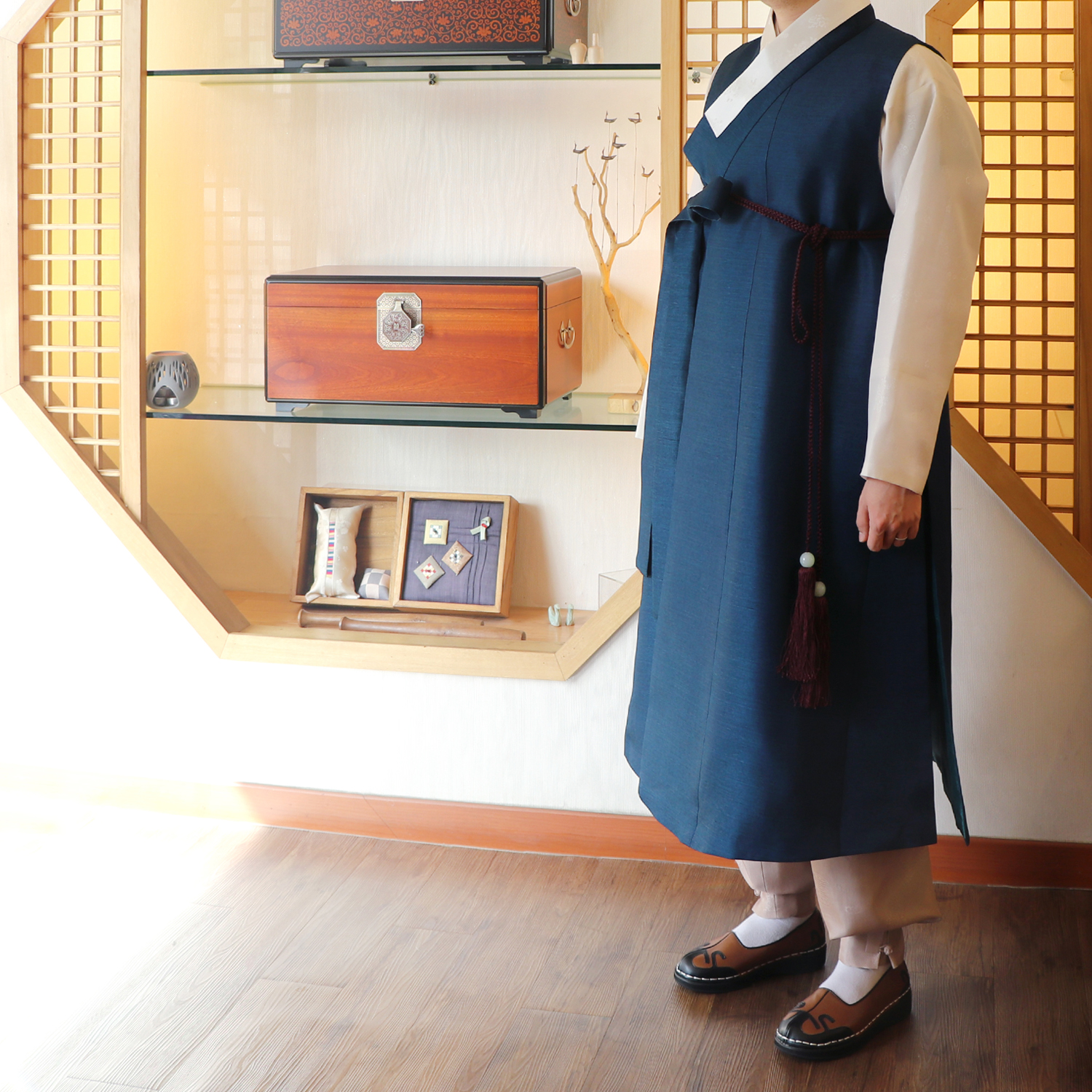 저고리와 바지를 밝은 색으로 맞추고, 가장 겉에 입는 긴 기장의 쾌자는 짙은 남색으로 지어 경쾌하면서도 무게감을 주었습니다. 쾌자 위에 술띠를 매어 장식을 더해주었고요.