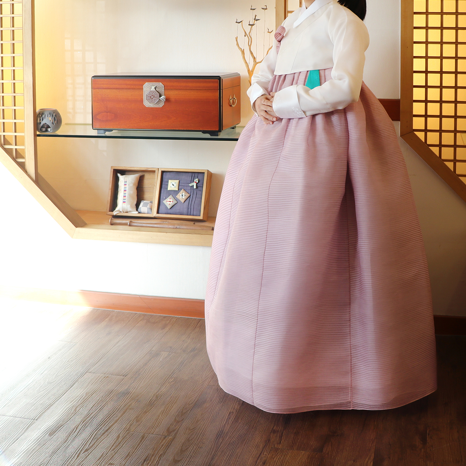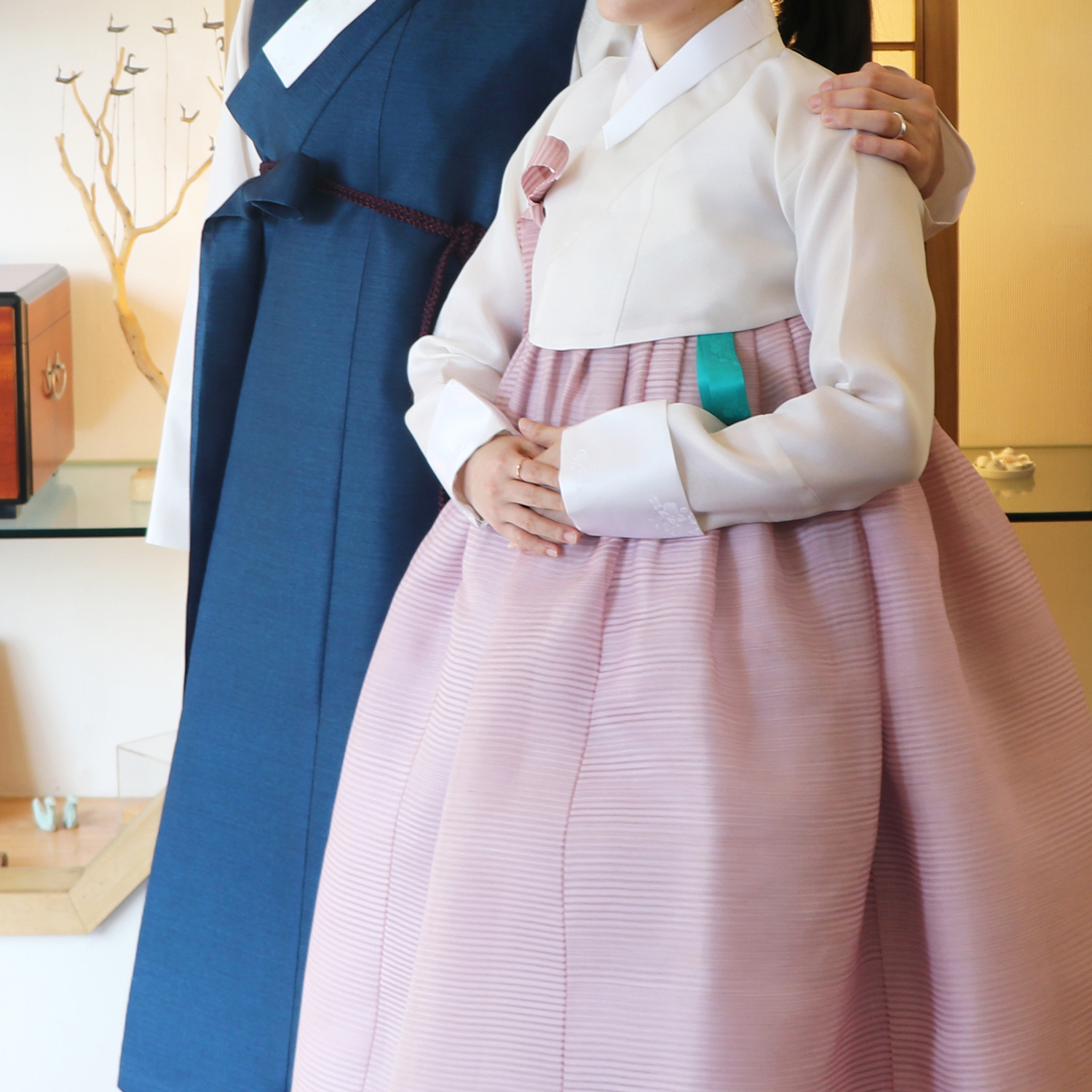 하얀 저고리와 연분홍색 항라 치마를 함께하고 밝은 옥색 안고름으로 포인트를 준 신부한복입니다. 밝은 분위기와 함께 우아함이 깃들어 있는 한 벌이에요.