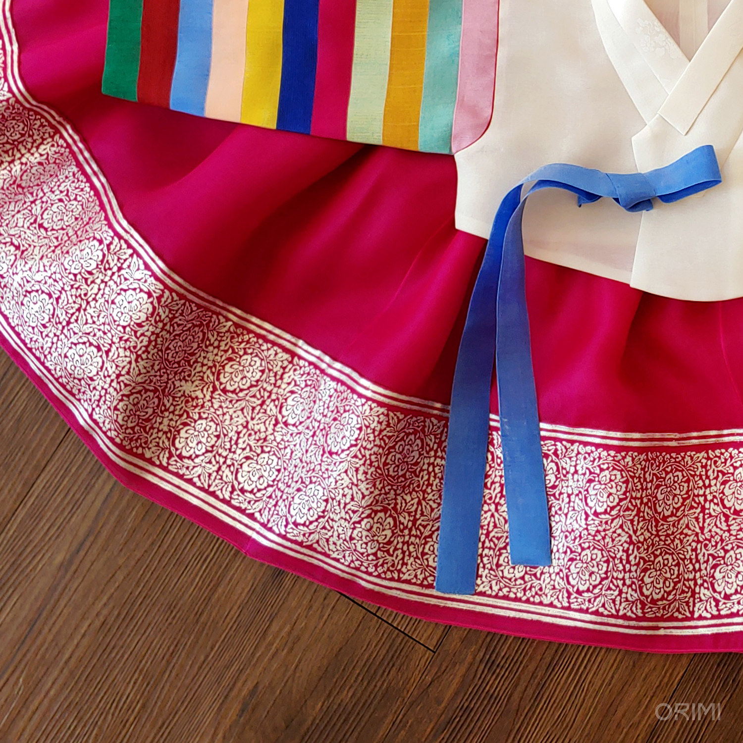 선명하고 밝은 비단들을 배색한 색동 소매를 단 저고리, 화사한 모란문을 은박으로 치맛단에 찍은 자주색 치마의 돌 한복입니다.