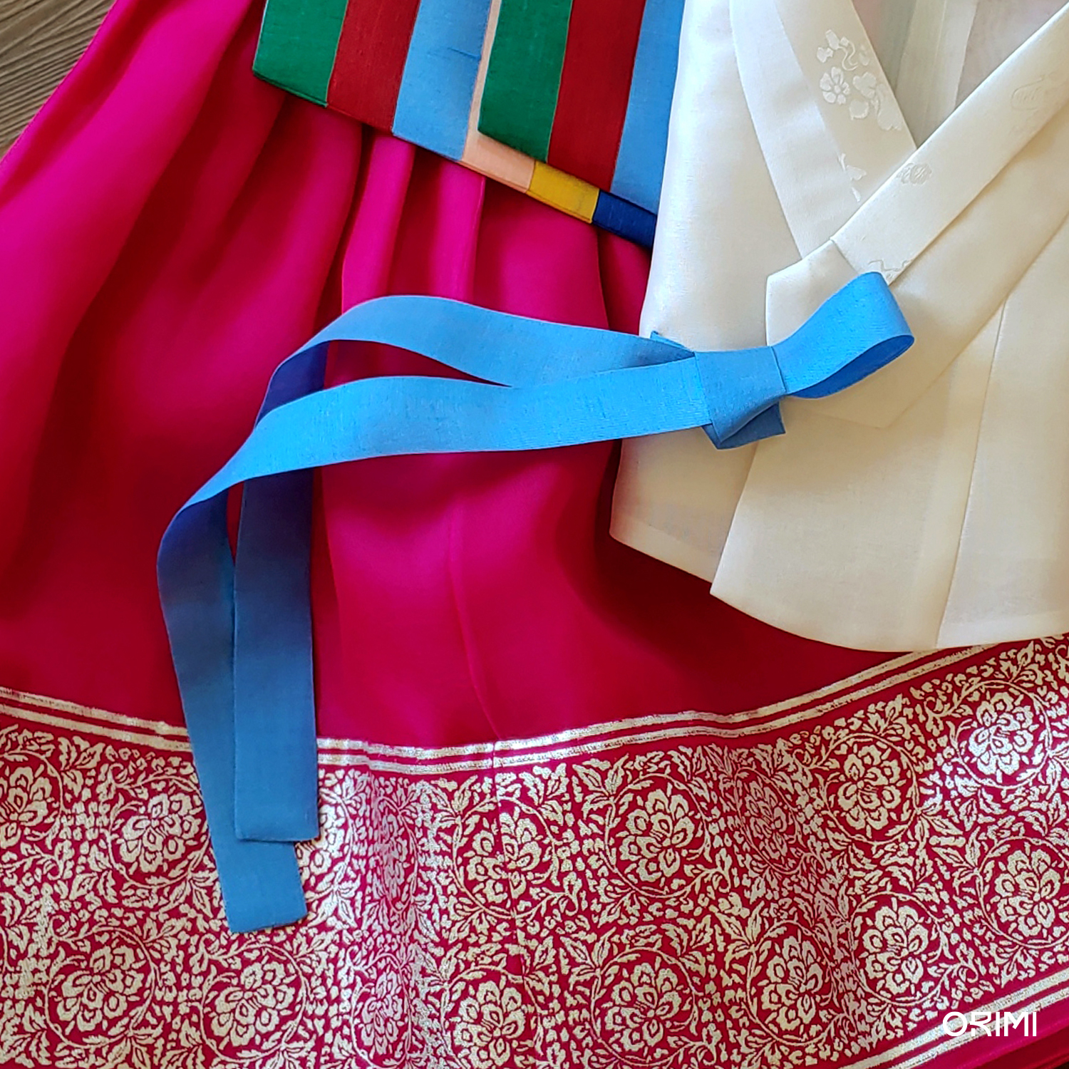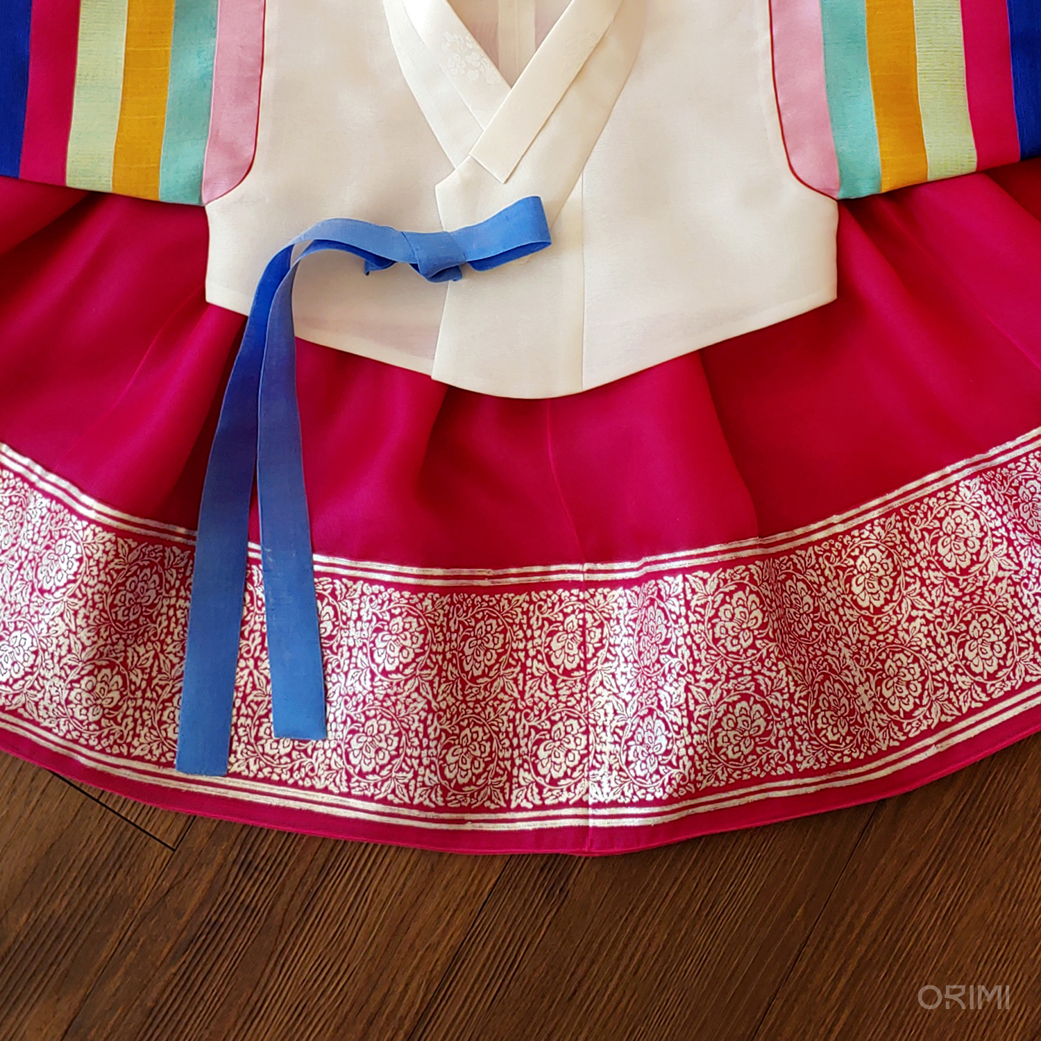 빳빳하게 다린 밝은 파랑색 고름을 단 하얀 색동저고리와 은박을 넓게 찍은 자주색 치마입니다.