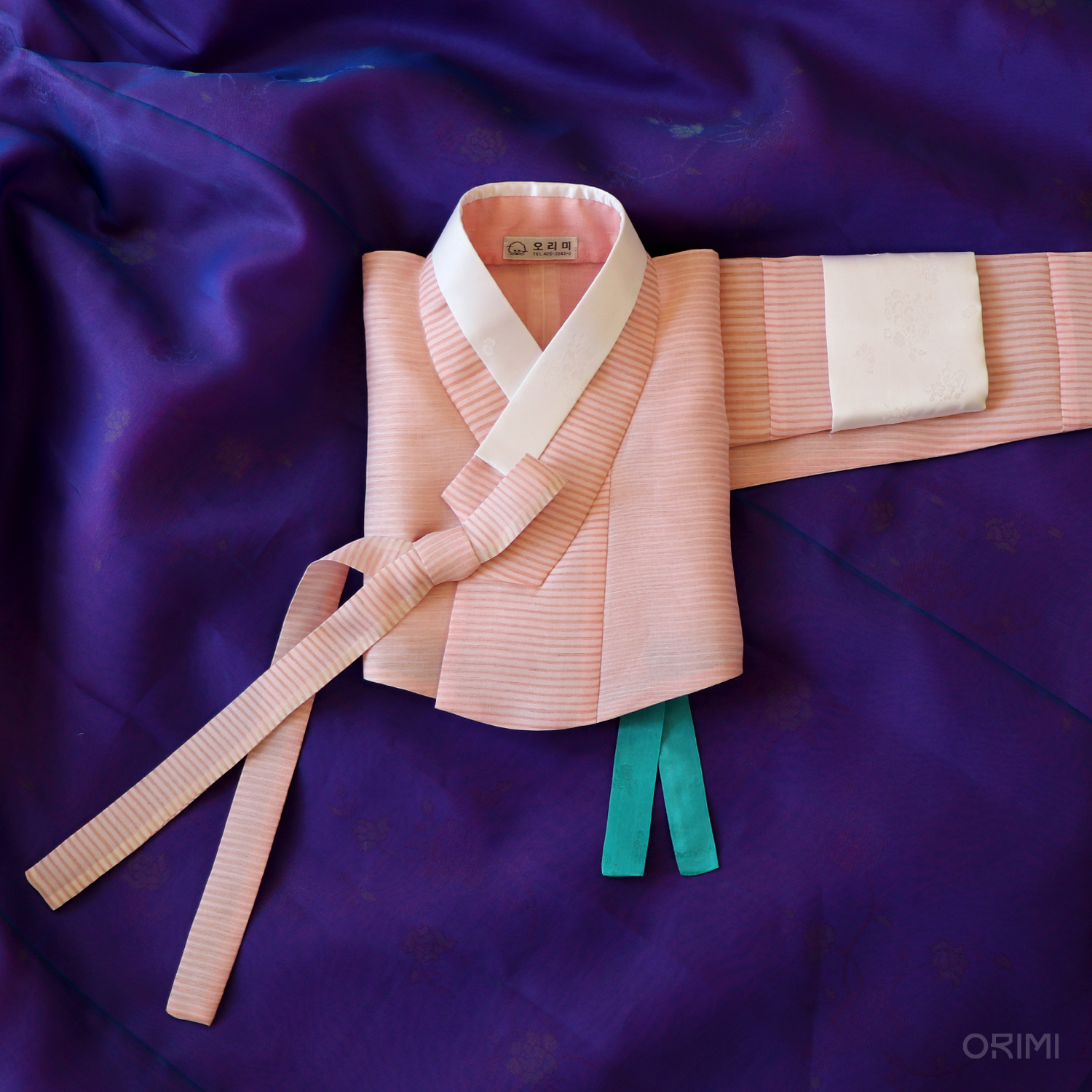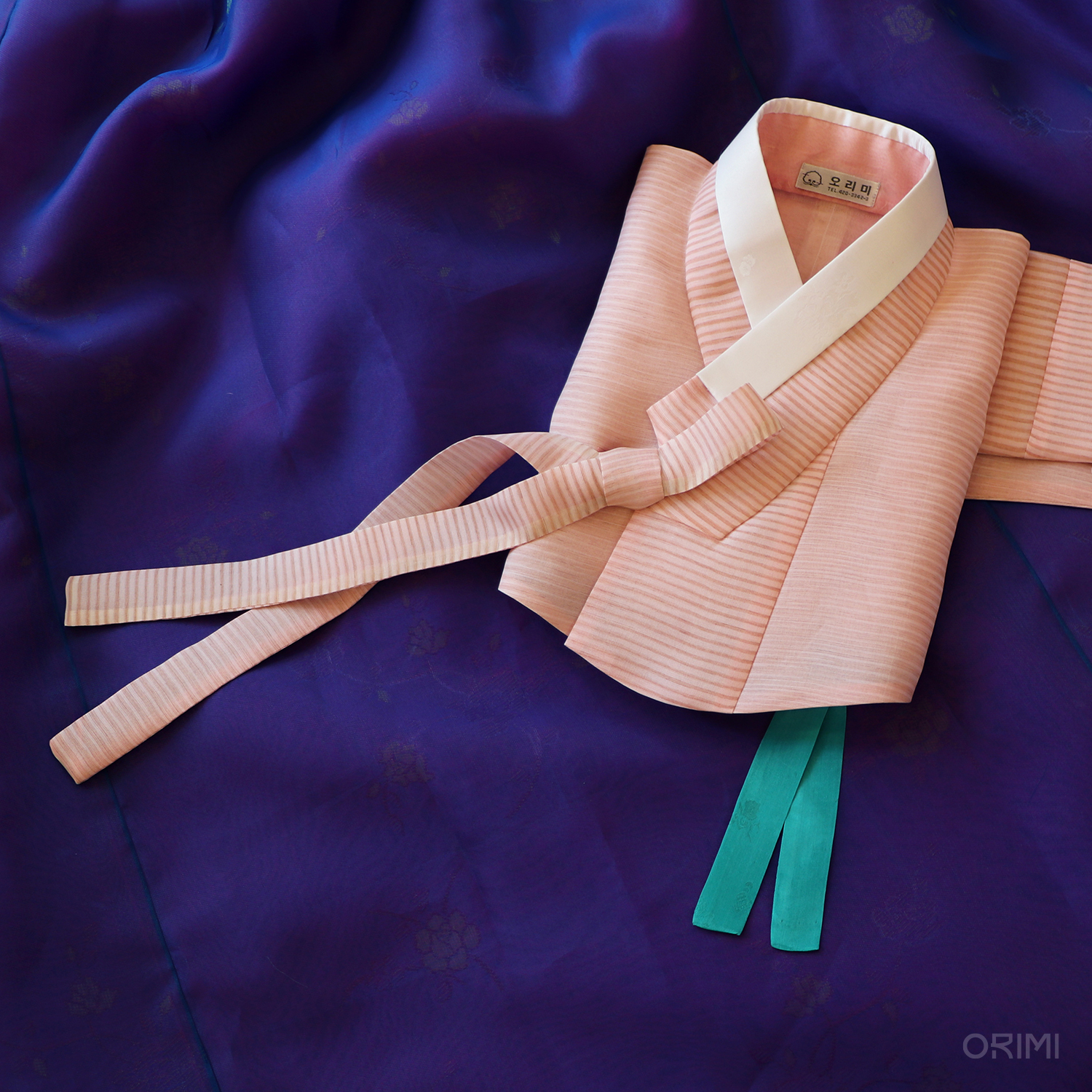 연분홍색 항라 저고리와 보라색 치마를 함께한 한 벌입니다. 밝은 청록색 안고름을 장식으로 달아 작지만 강한 효과를 더해주었어요.
