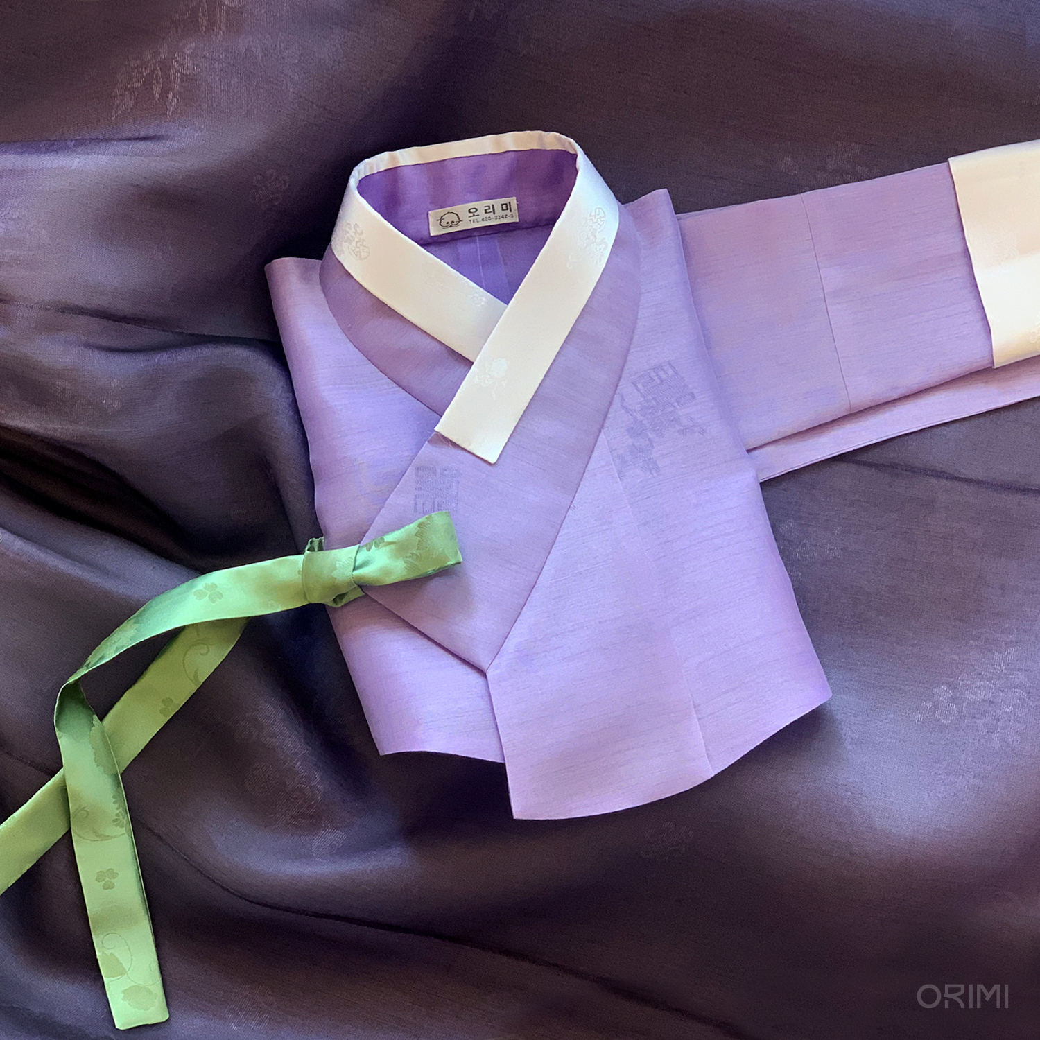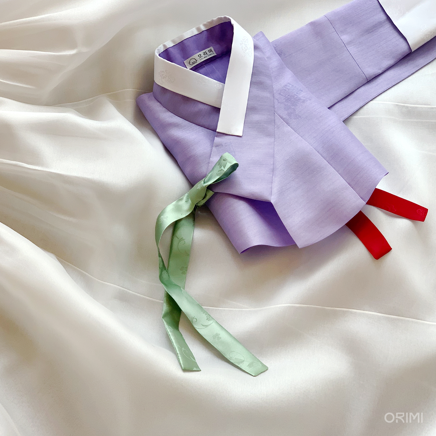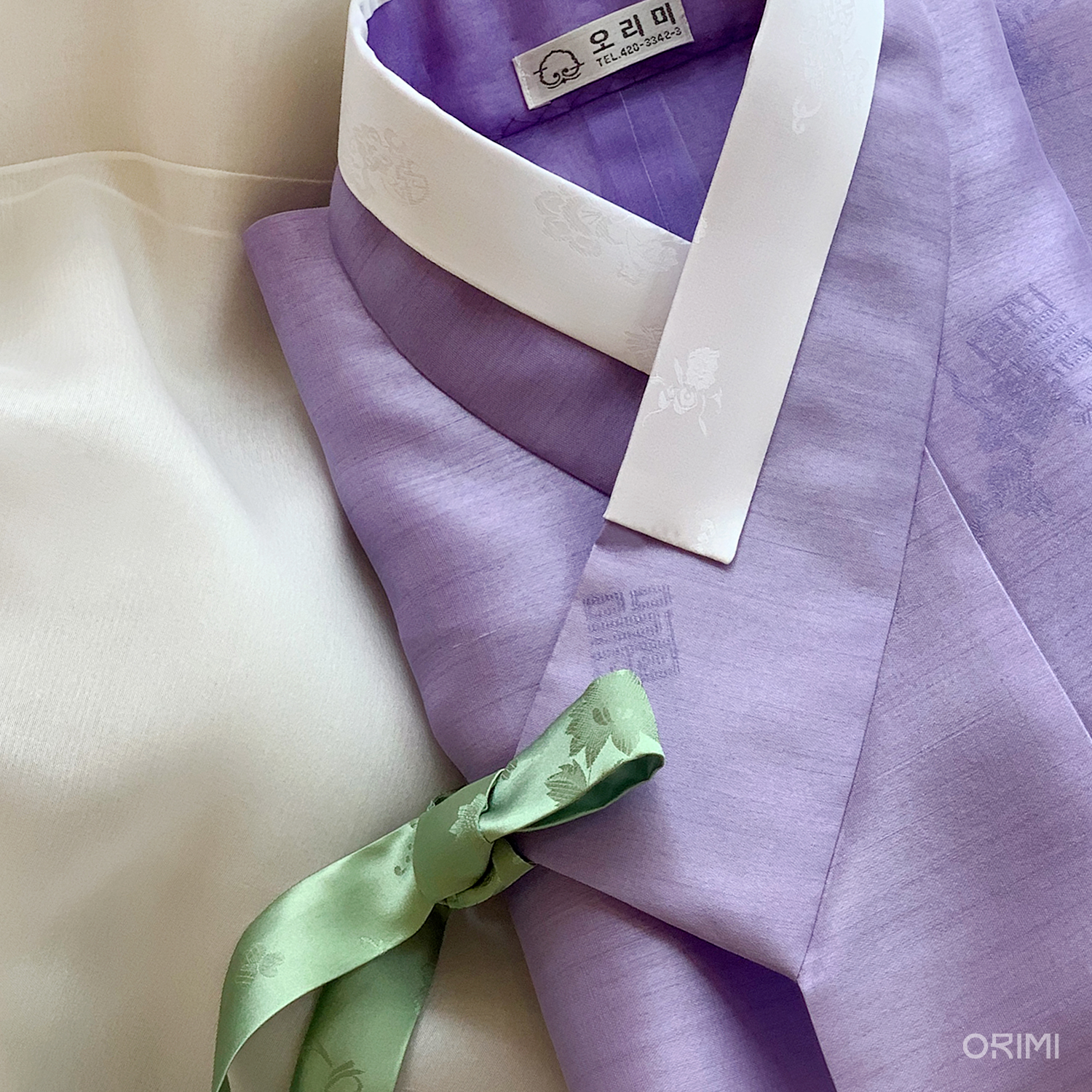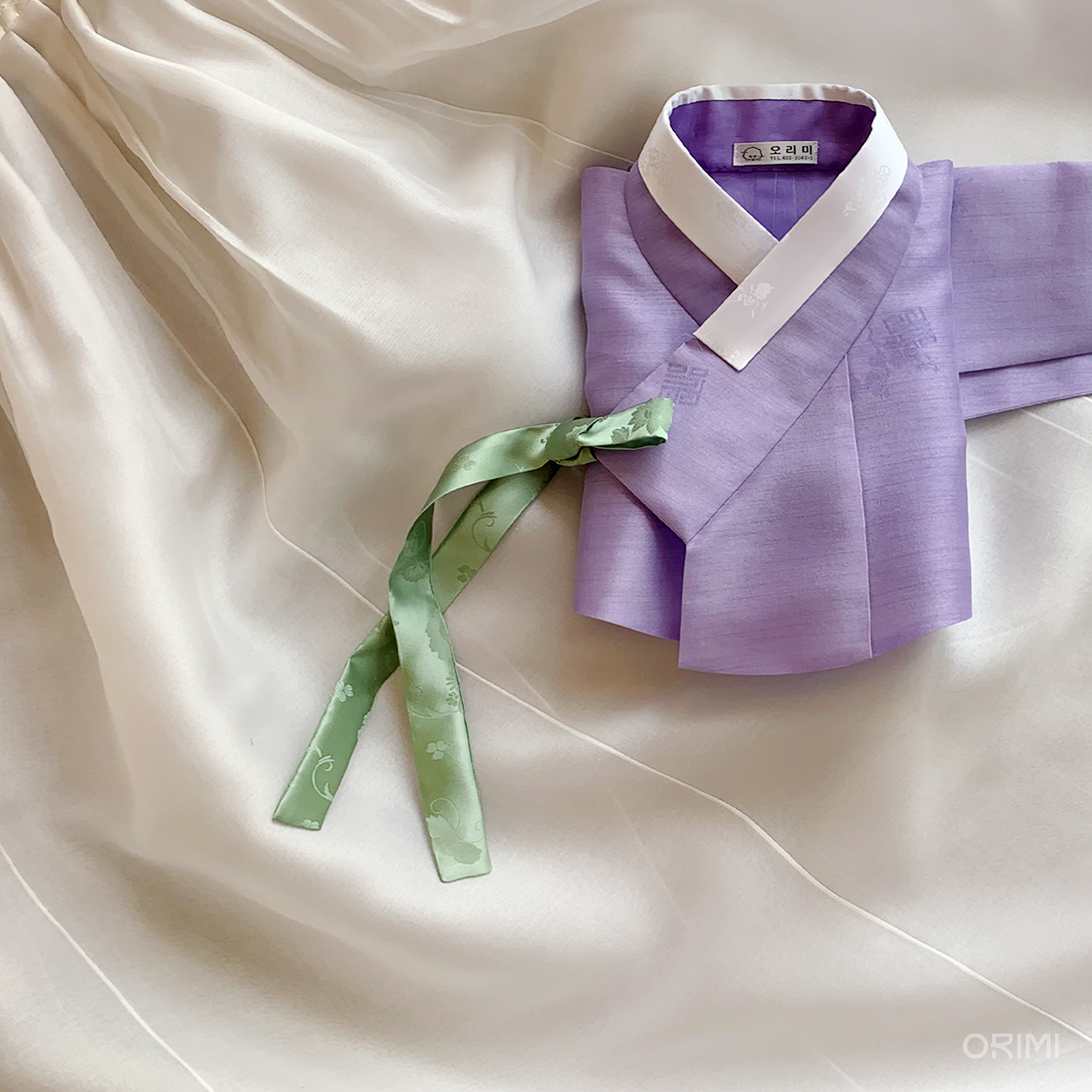 밝은 연보라색 저고리와 흰색 치마가 만나 맑고 환한 분위기를 연출합니다.