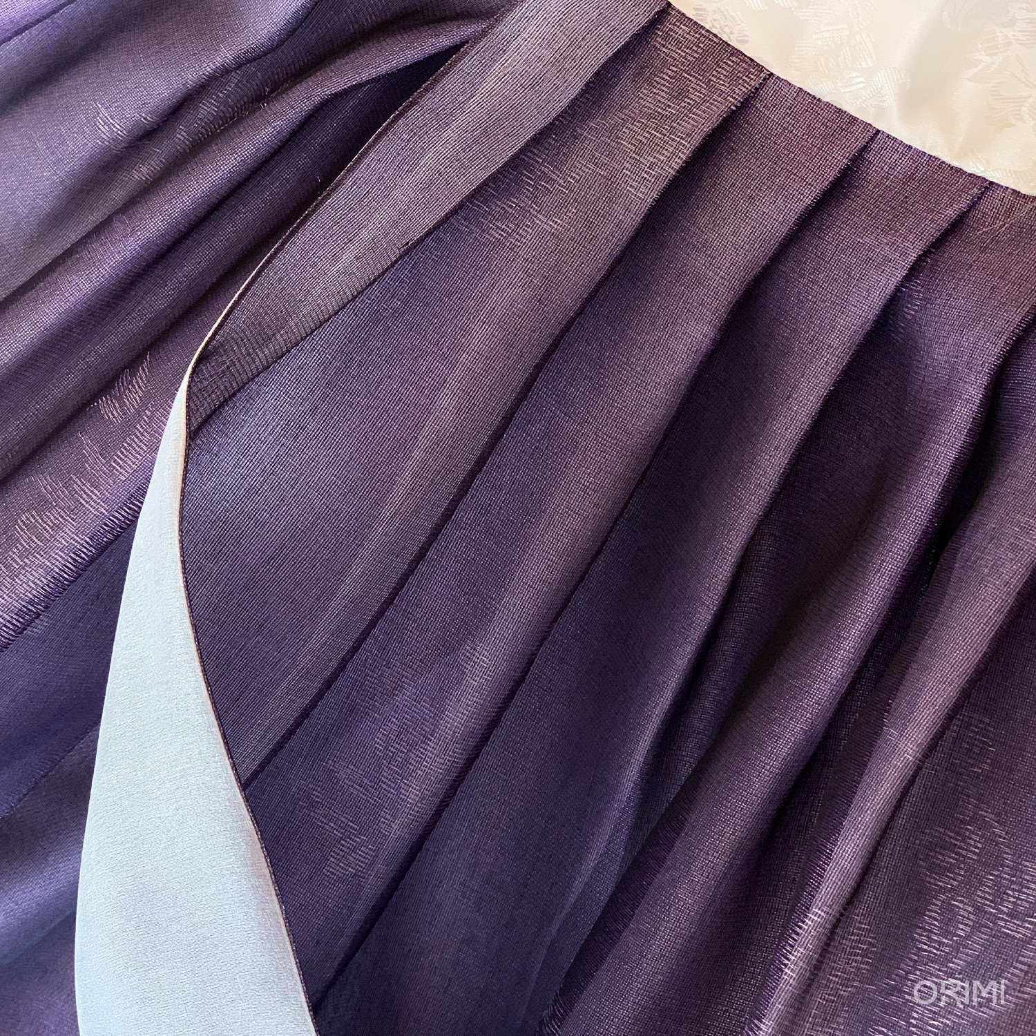 예비 신부님께서 추가로 맞추신 진보라색 치마입니다. 하얀 치마를 함께했을 때와는 전혀 다른 분위기로 입을 수 있도록 선택한 색상입니다.