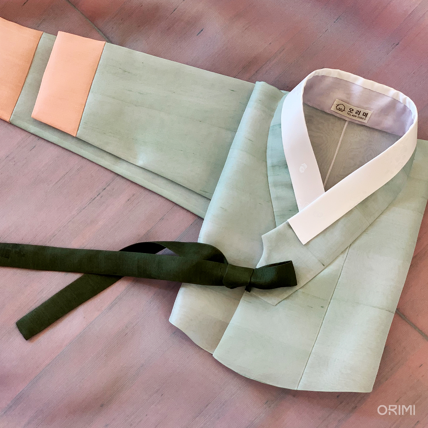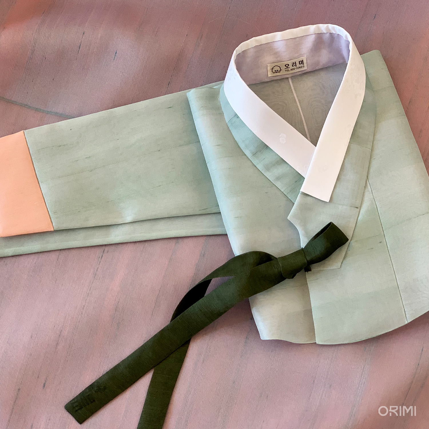 연한 옥색 저고리에 살구색으로 소매를 배색해 독특한 멋을 더했습니다. 짙은 풀색으로 고름을 달고 푸른빛과 붉은빛이 번갈아 자기 색을 주장하는 치마를 함께한 한 벌입니다.