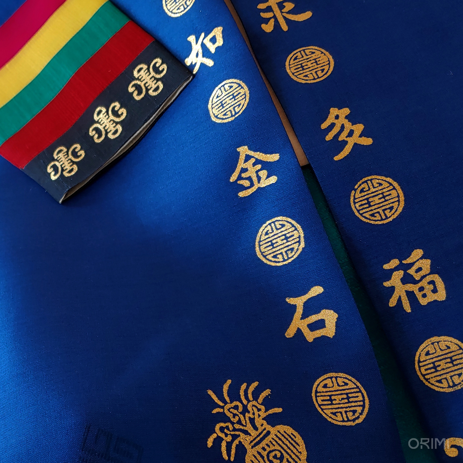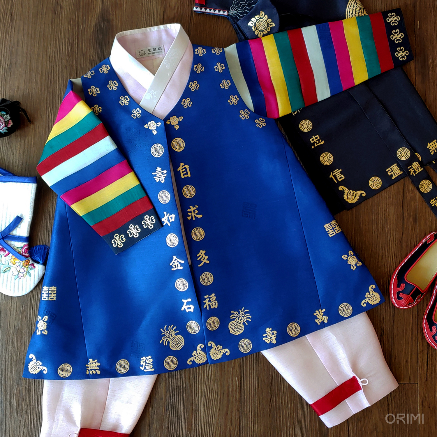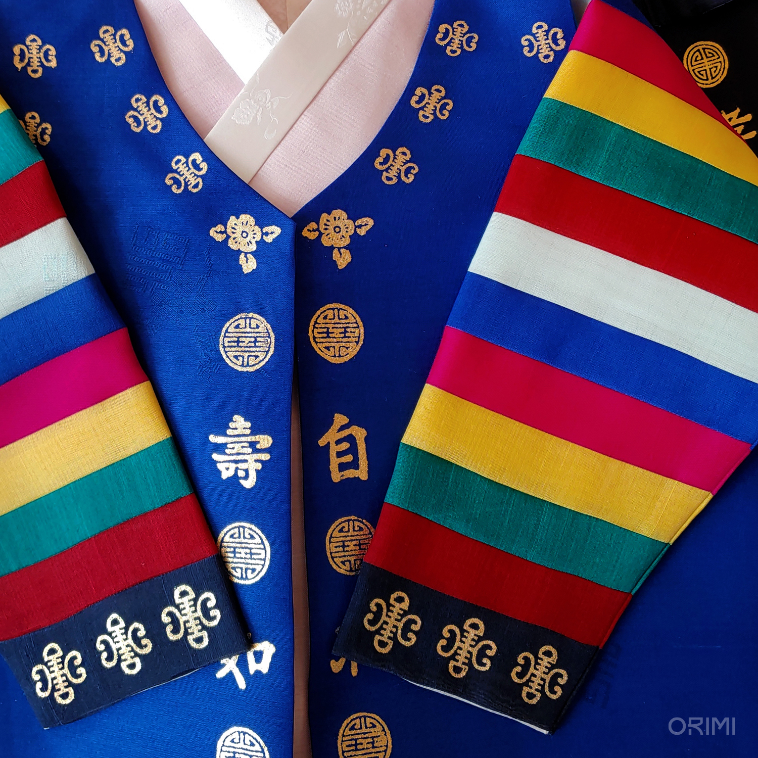 소매의 색동은 옛날 그 어느 시절에 전통적으로 가장 많이 쓰였던 선명하고 쨍한 색상들만을 골라 배색했습니다.