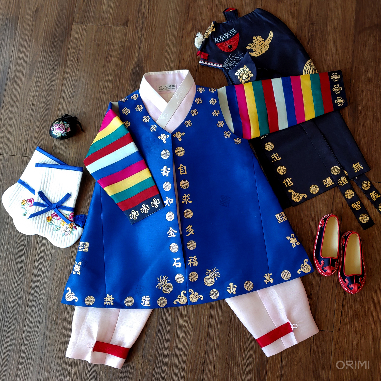 어렸을 적 부모님 사진에서 본 듯한, 정말 전통적인 배색의 색동이죠? 목깃이 없는 형태의 새파란 전복도, 금박의 위치들도 모두 전통 돌한복의 느낌을 최대한 살려 지었습니다. 예로부터 아이가 돌이나 생일날에 썼던 호랑이 얼굴 모양의 모자인 '호건'을 함께해 전통적인 분위기를 완성합니다.