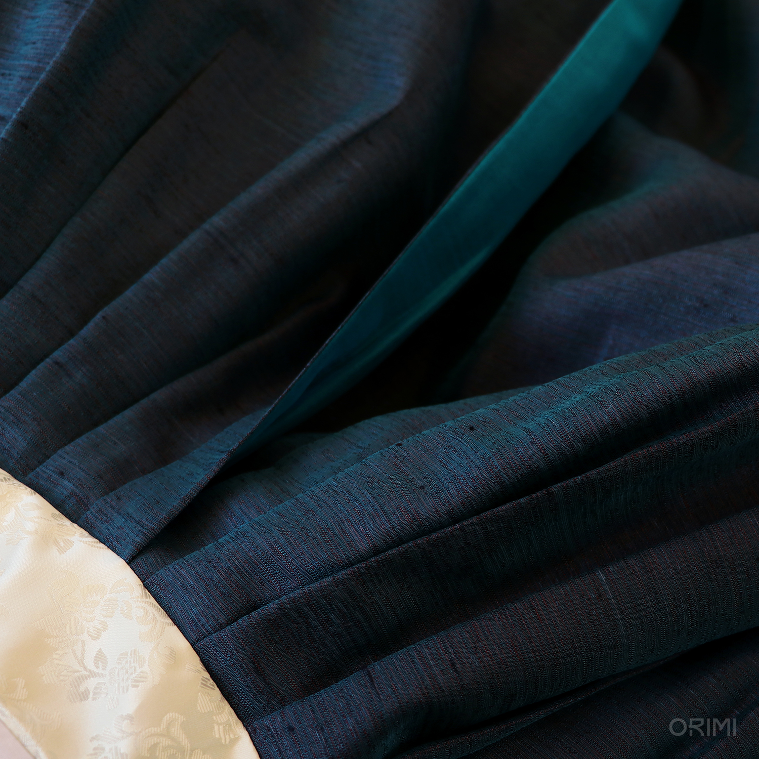 청록색 안감을 품어 밝게 비쳐나오는 푸른 빛을 가진 남색 치마. 거칠고 끊기며 겹겹이 겹친 가로줄 질감이 정말 멋진 원단입니다.