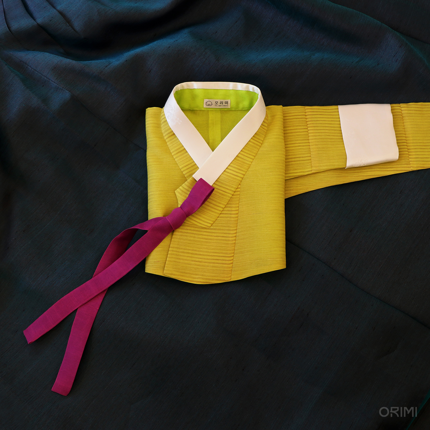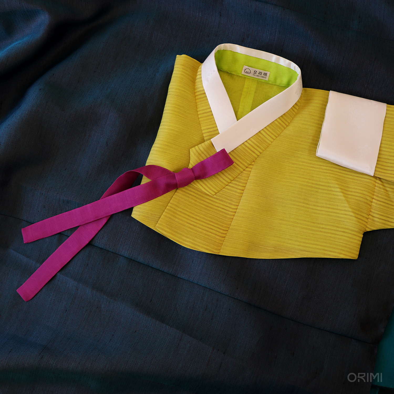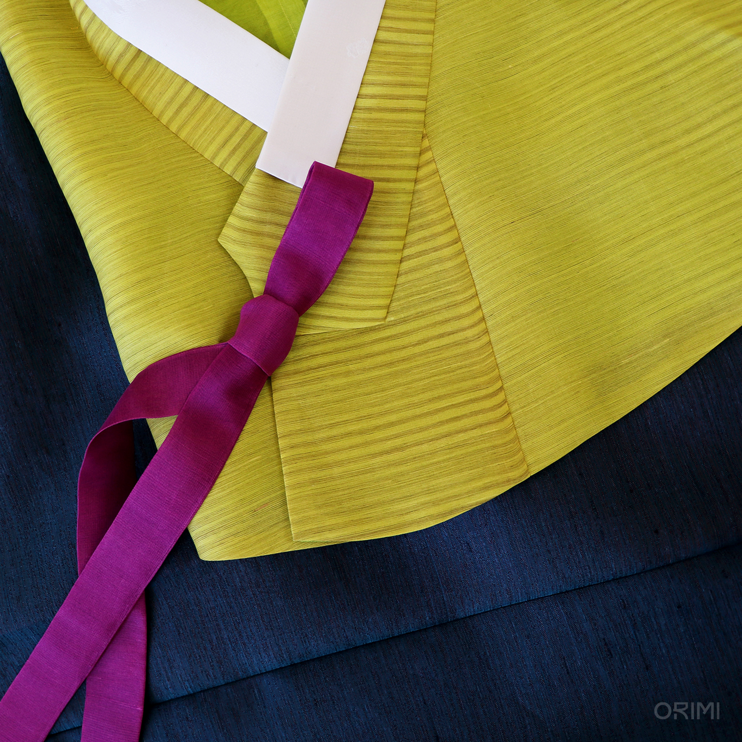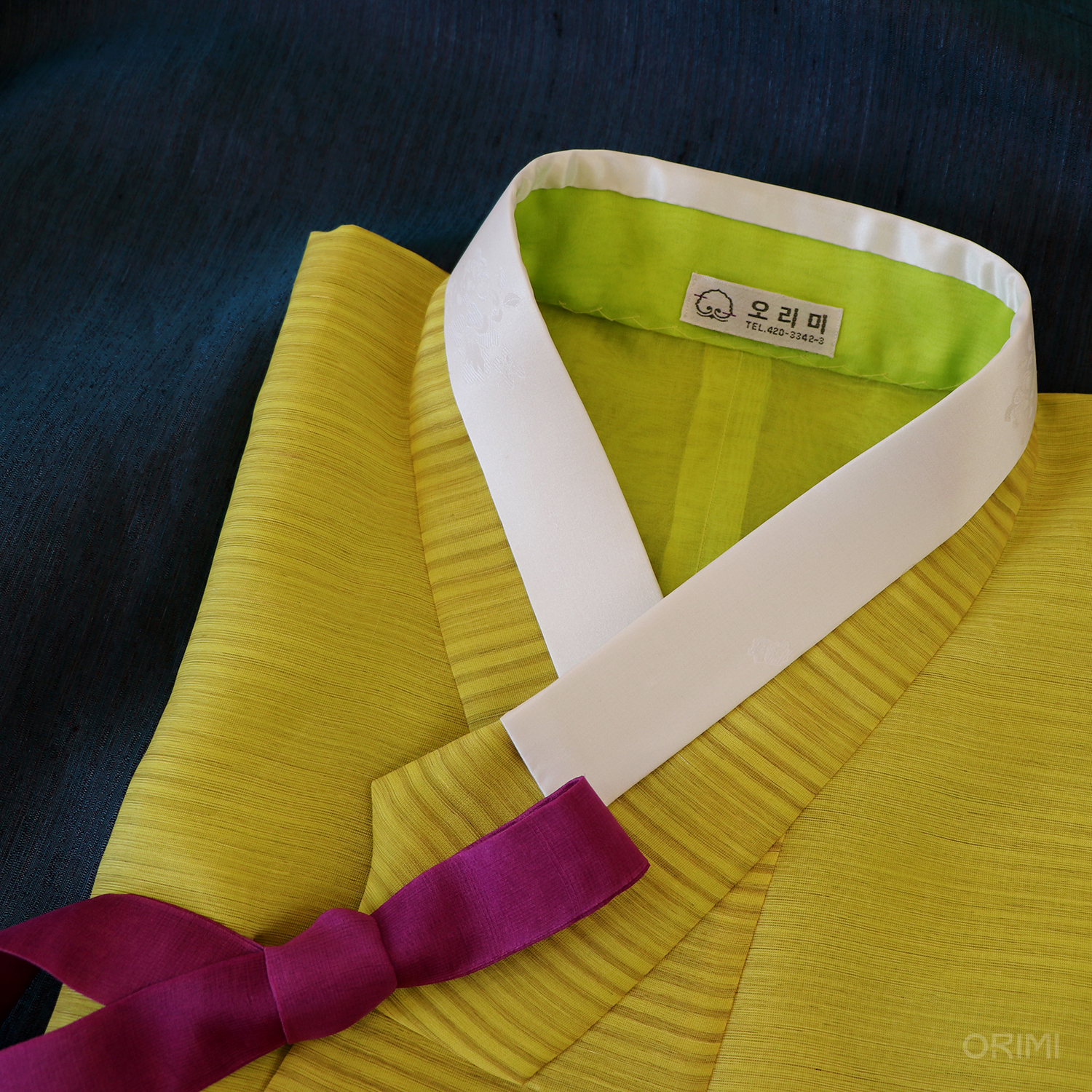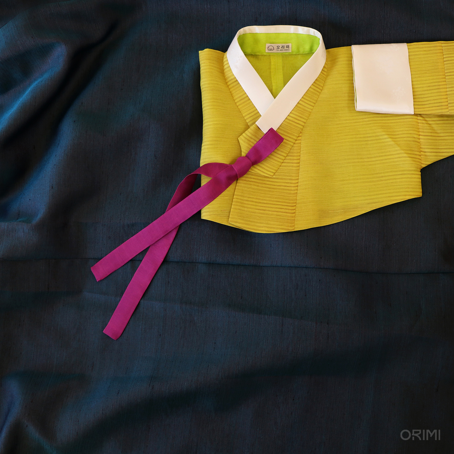 밝은 연두빛 안감을 넣어 조금 더 깊이있는 색감을 보여주는 진노랑 저고리와의 조합이 멋진 한 벌로 완성되었습니다.