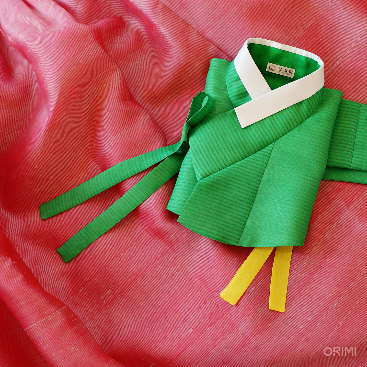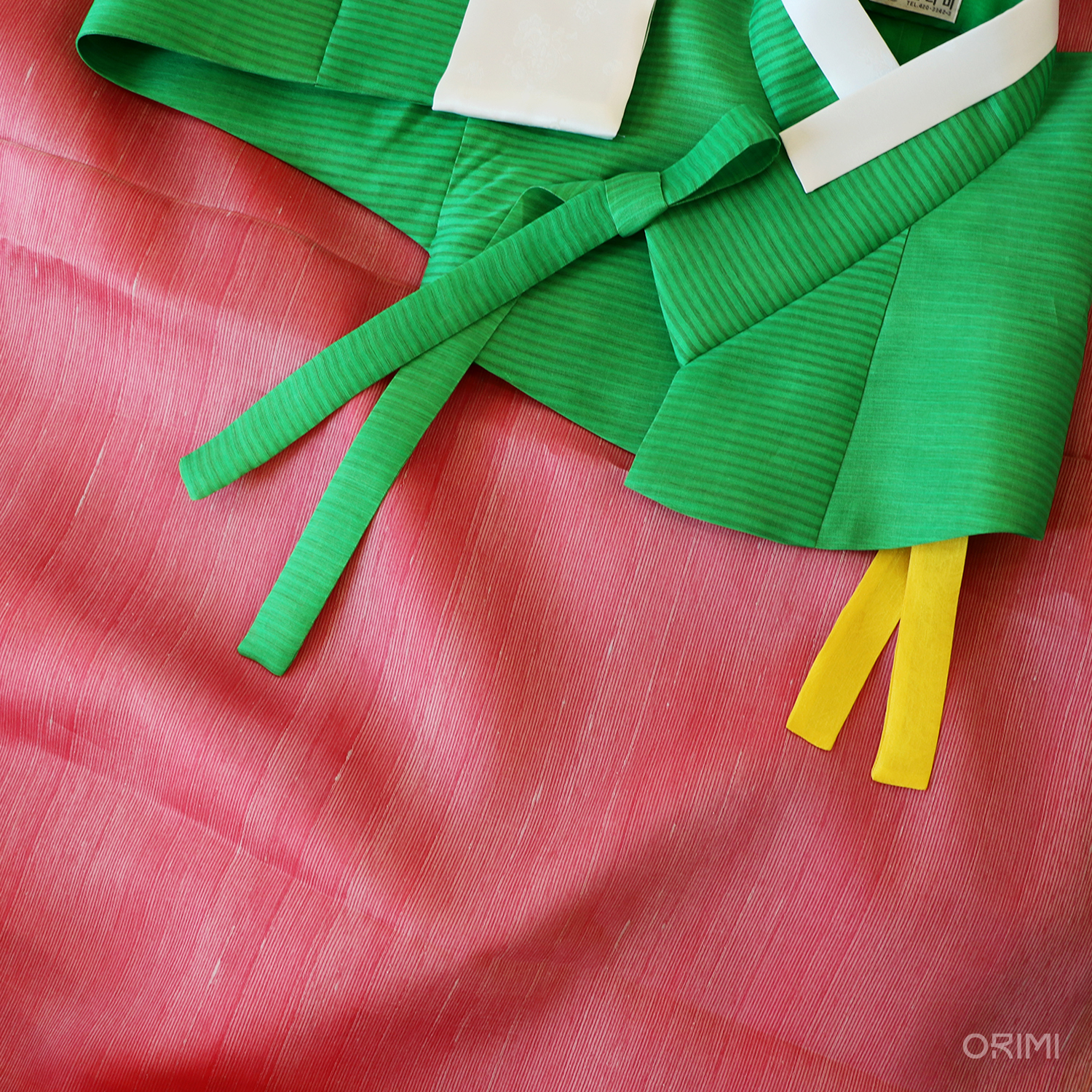 오리미가 재해석하는 2020년의 녹의홍상, 선명한 초록색 항라 저고리에 선홍빛 치마의 밝고 경쾌한 신부한복입니다.