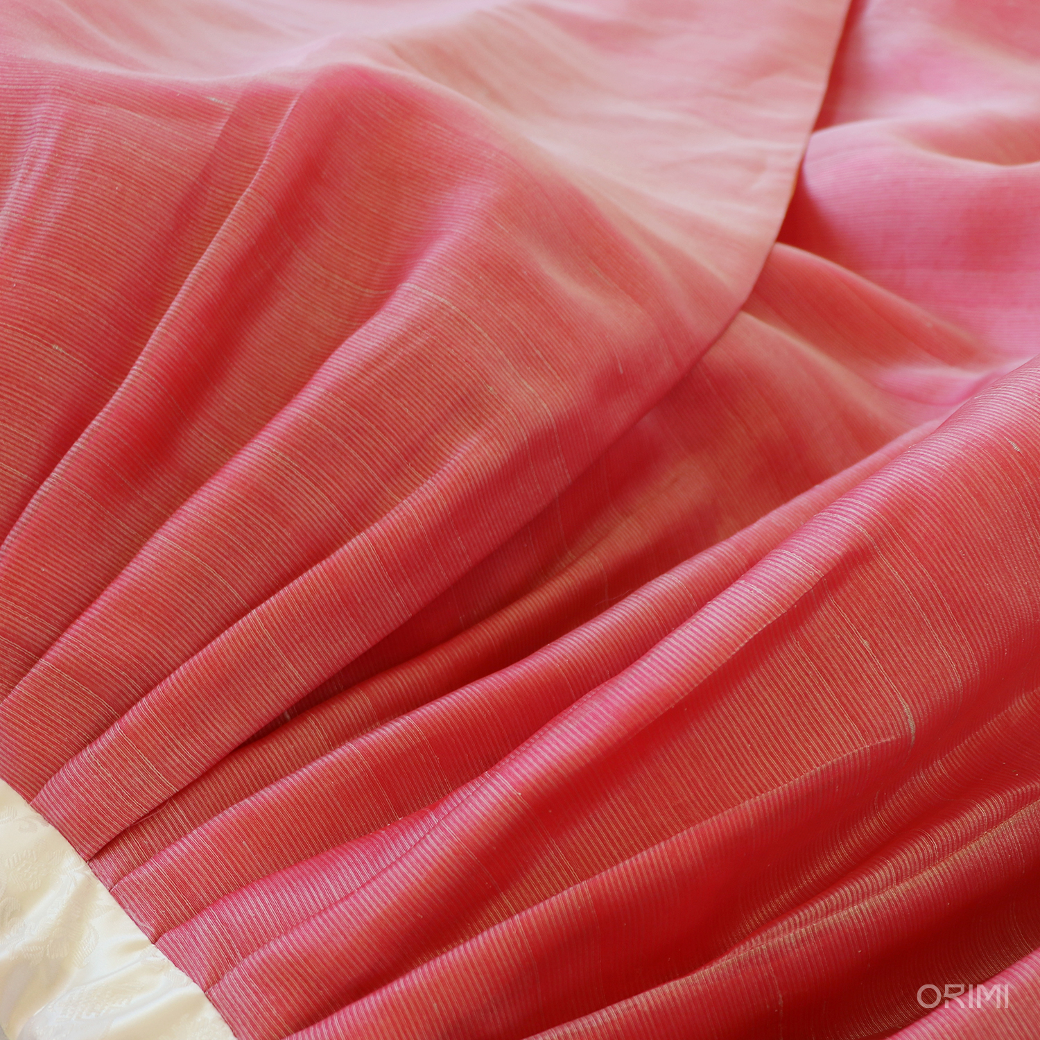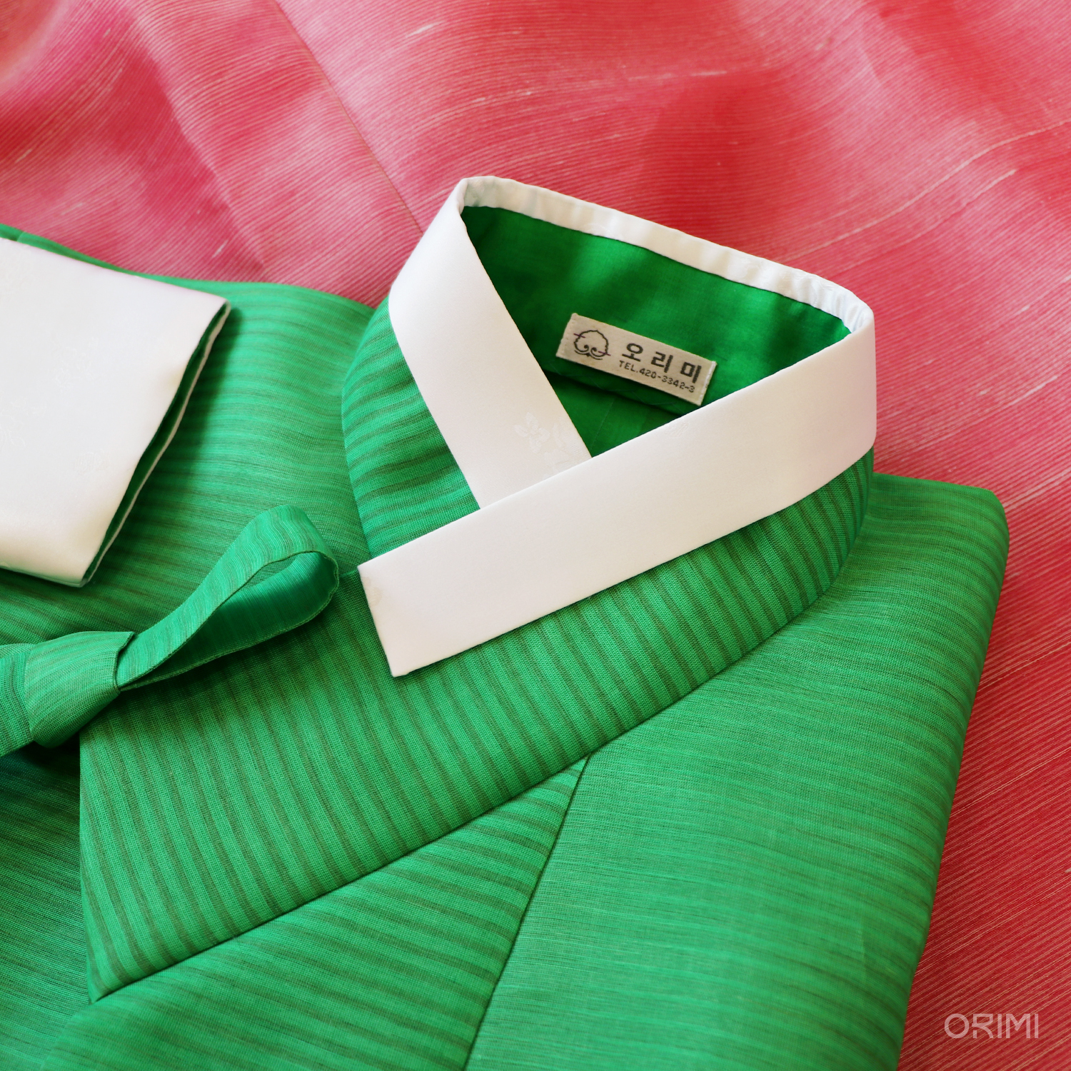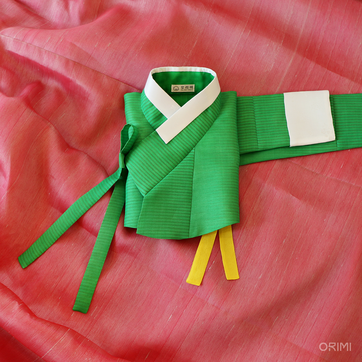 겹겹이 겹친 고동색 가로줄이 모여 줄무늬를 만들어내는 초록색 항라 저고리. 여러 색들이 리듬감 있게 결을 그리며 짜여진 가로줄 사이로 안감의 색이 비춰져 더 매력적인 선홍색 치마가 함께한 신부한복입니다.