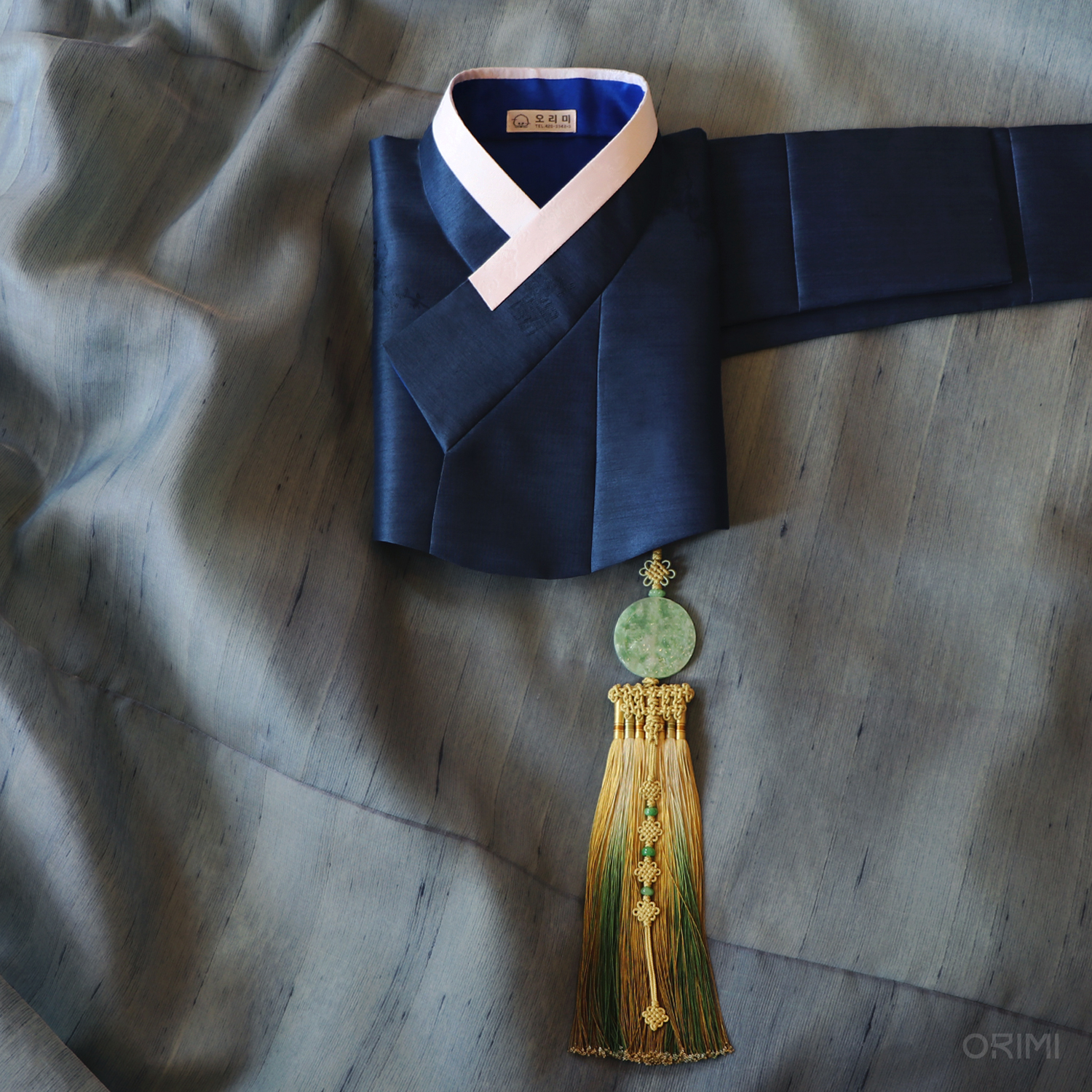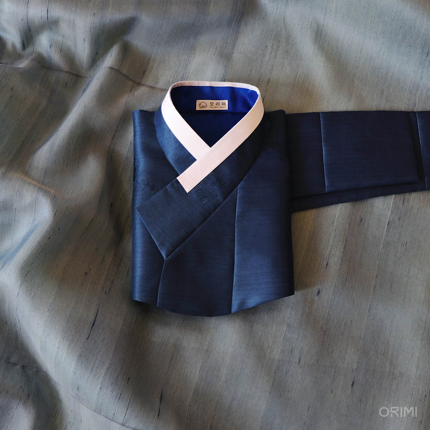 은은하게 들어간 가로줄과 깊은 색감이 멋진 진남색 저고리에는 고름을 생략해 깔끔한 인상을 연출합니다.