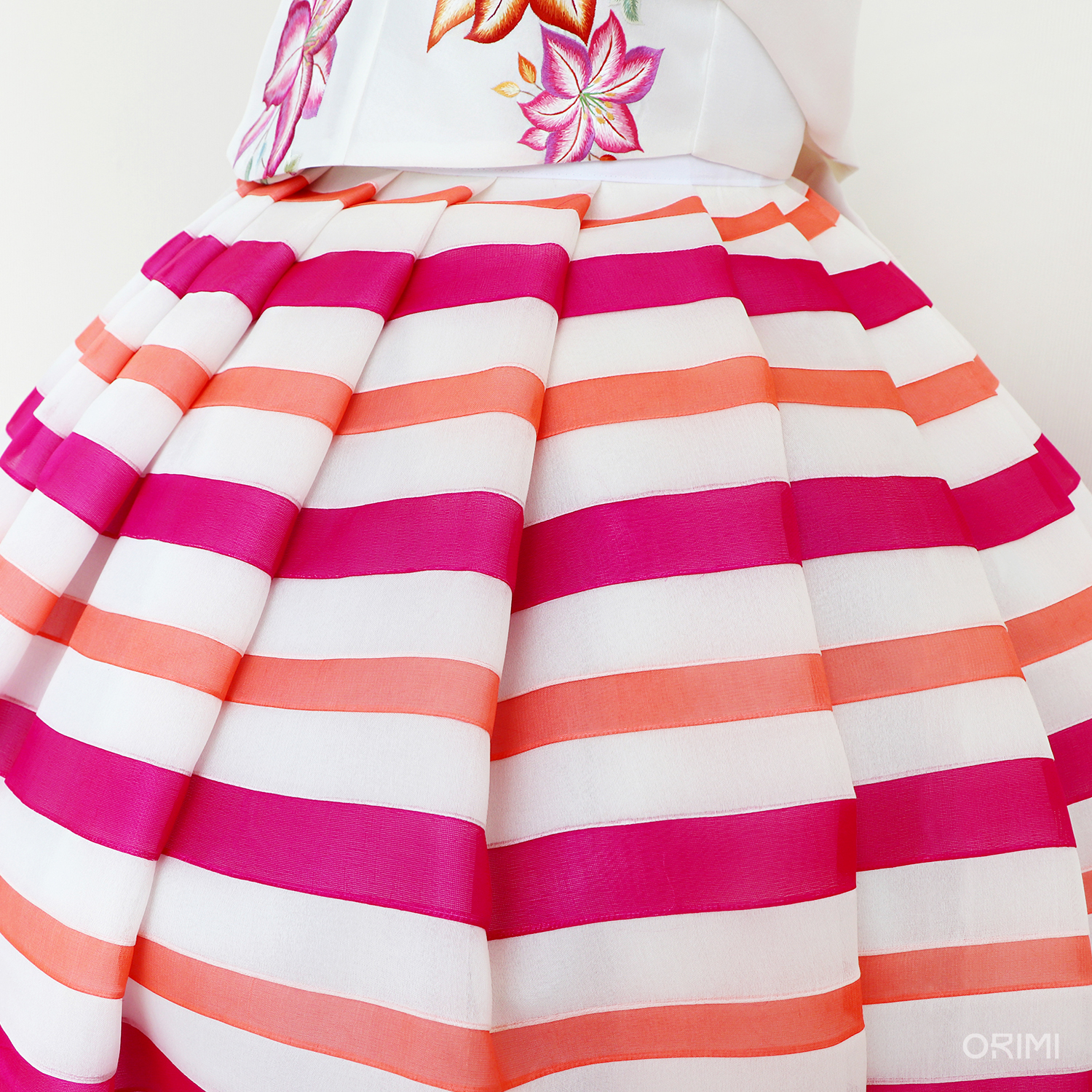 하얀 저고리엔 주황색과 자주색의 자수 꽃이 피어나고, 한 줄 한 줄, 정성스레 자르고 이어 만든 주황색과 자주색이 섞인 줄무늬 원단으로 치마를 지었습니다.