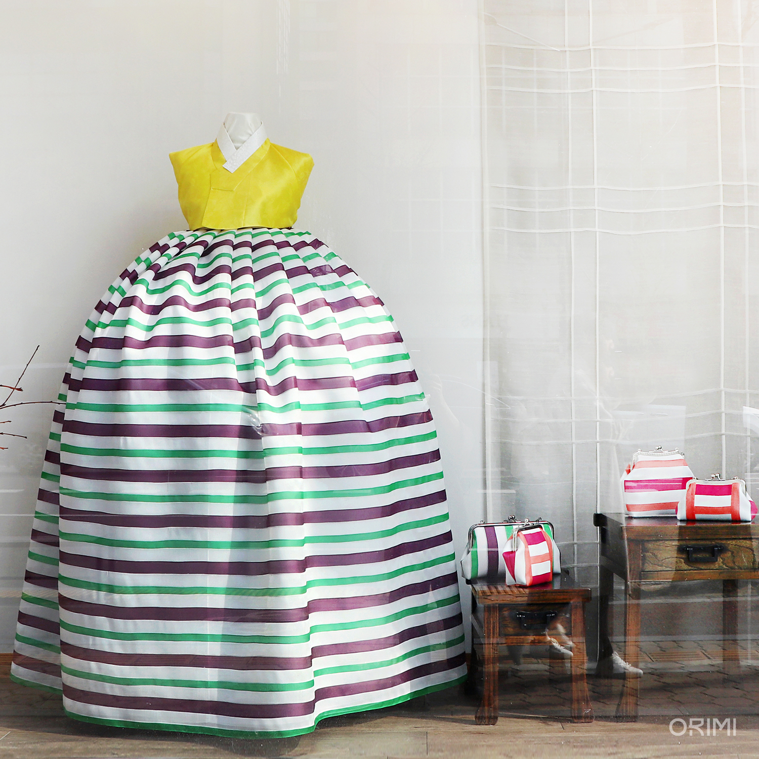 오리미의 봄을 대표하는 이미지인, 디스플레이용 한복들을 만들면서 함께 만든 다양한 클러치입니다. 봄 옷에 적용한 기법과 색상을 활용하여 조금씩 다른 크기와 형태에 적용해 보았어요.
