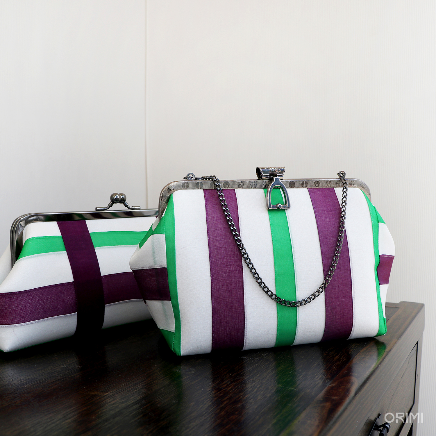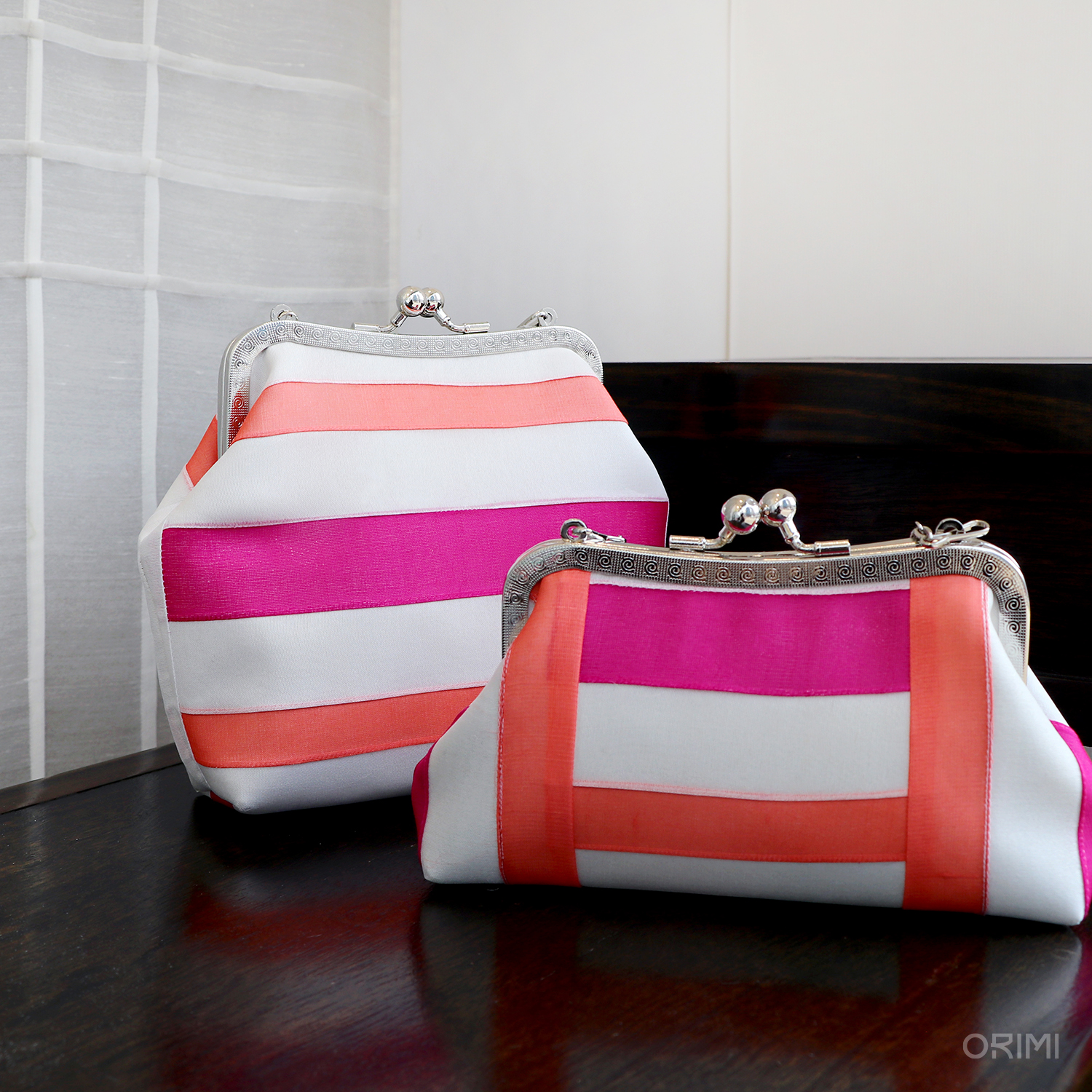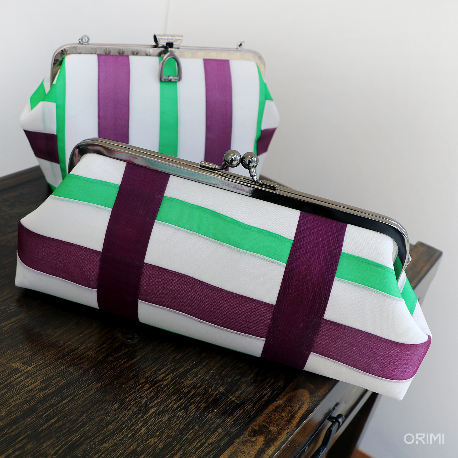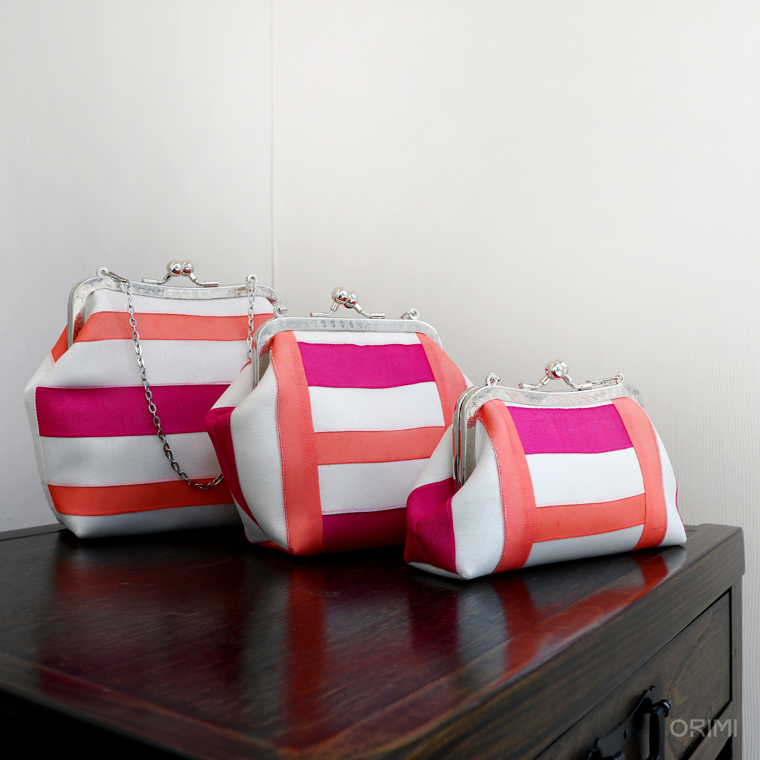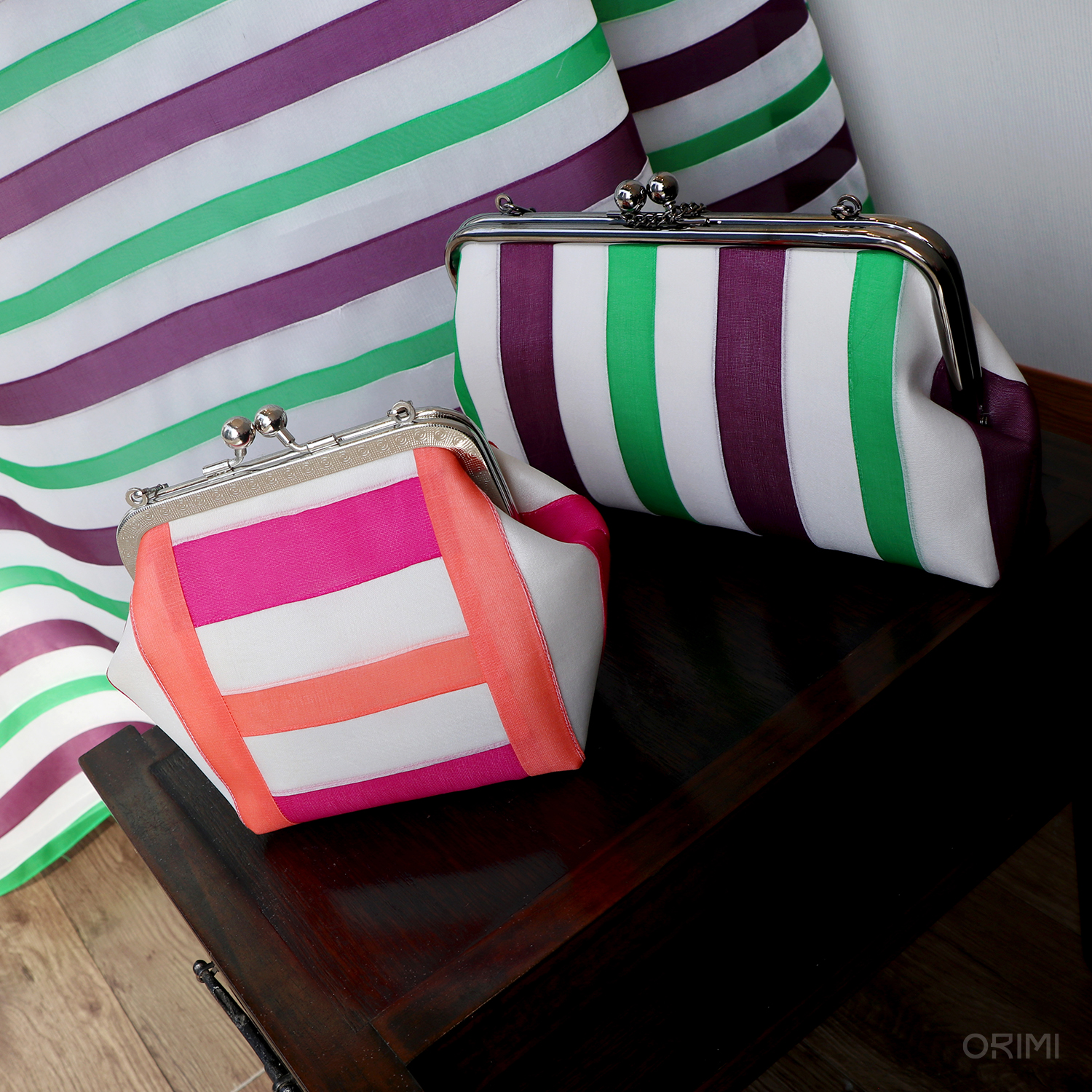 오리미의 봄을 대표하는 이미지인, 디스플레이용 한복들을 만들면서 함께 만든 다양한 클러치입니다. 봄 옷에 적용한 기법과 색상을 활용하여 조금씩 다른 크기와 형태에 적용해 보았어요.