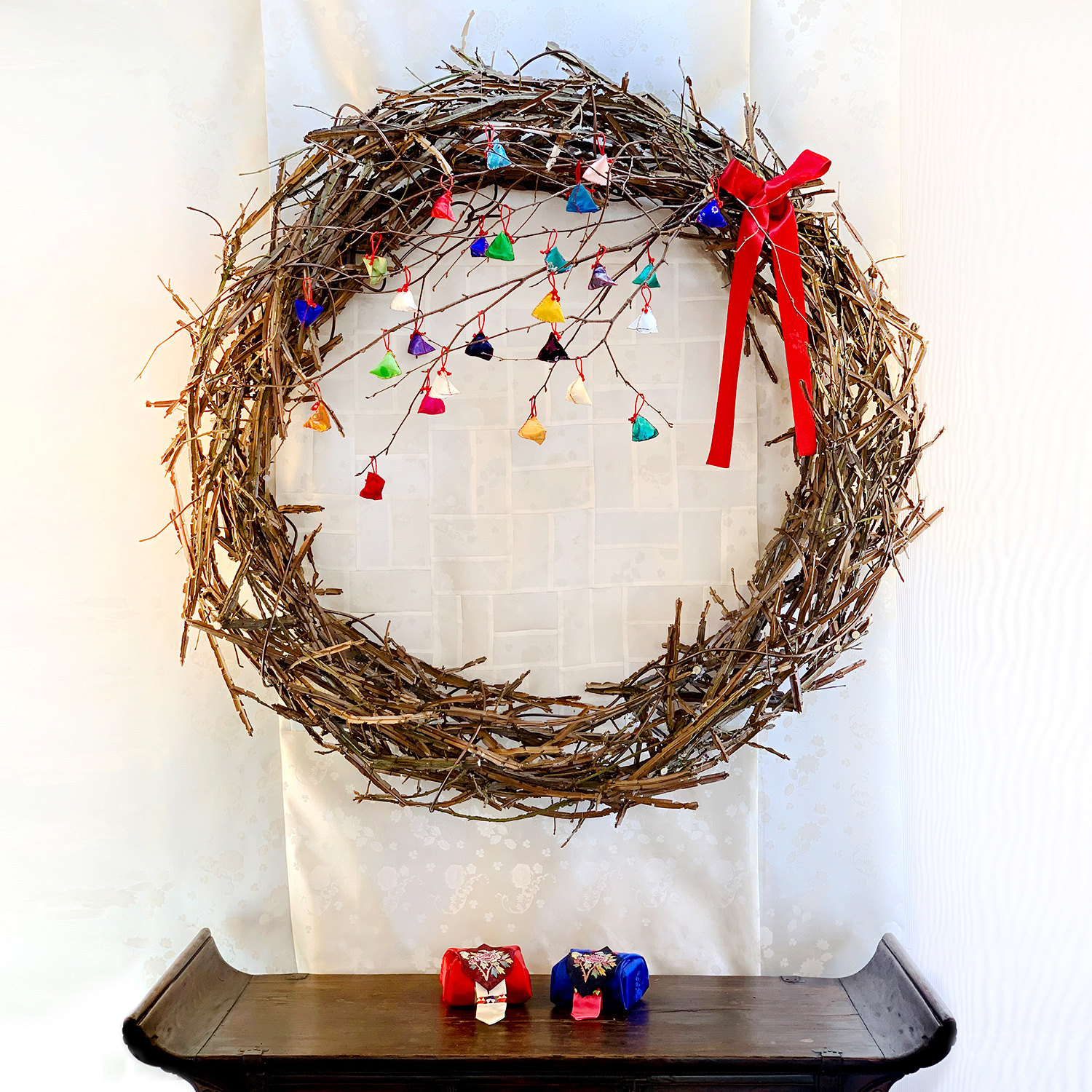 매장으로 가져온 화살나무 리스에 작은 비단 주머니들을 쪼르르 달아 장식하고, 새빨간 한복 고름을 리본으로 묶어 장식해줍니다.