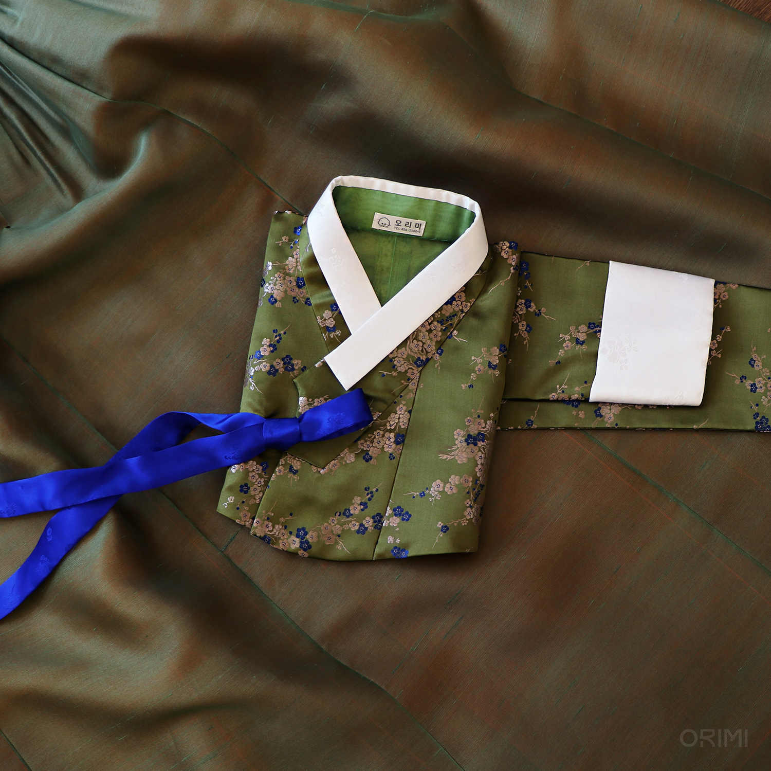 분홍색과 파란색 매화가 한가득 피어난 매화 가지 문양이 짜여진 풀색의 양단 저고리. 문양 속 매화꽃처럼 새파란 고름을 달았습니다. 치마 역시도 비슷한 풀색의 치마이지만, 안에서 배어나오는 붉은 빛이 오묘하지요.
